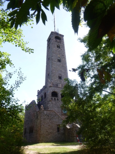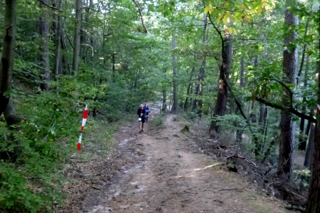 Am Bismarckturm rechts vorbei, dann auf schönem Trail runter. Weit das Tal aufwärts, am gut gelaunten Posten abwärts wieder zurück. Der Forstweg wandelt sich bald in etwas schmales, überwachsenes um, dann folgen noch so ein paar interessante Trailpassagen, eine Sturmschneise muss gequert werden. Erst kurz vor dem VP ist es besser. Da stehen auch wieder äußerst nette Helfer. Offiziell nur Getränke, aber tatsächlich gibt es viel mehr. Der Trail geht weiter, schmal aber gut laufbar, bis zum Forstweg. Dann dürfen wir rechts hoch über den Berg. Oder fast. Lausig und vor allem endlos. Und wieder runter, genauso.