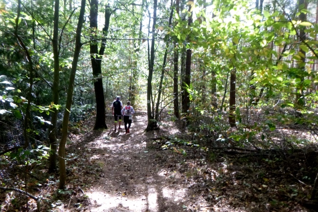 Somit kommt mir ab hier die ungeteilte Aufmerksamkeit der noch verbliebenen Posten und eines äußerst freundlichen Besenradlers zugute und natürlich im Ziel erst recht! Also, mit Gas weiter. Der schöne Trail setzt sich fort, er mündet auf eine Forststraße, immer schön bergab. Hier ist noch Abkürzung B, rechts der Tote Mann bleibt mir diesmal erspart. Ich bin jenseits des cutoff. Noch einen Damm hoch und auf guten Wegen nach Höningen. Ein toller Ort. Altes Kloster, alte Mauern. Und die Speisekarte der Klosterschänke – für später. (Der Saumagen mit Kastanien und Sauerkraut – lecker!)