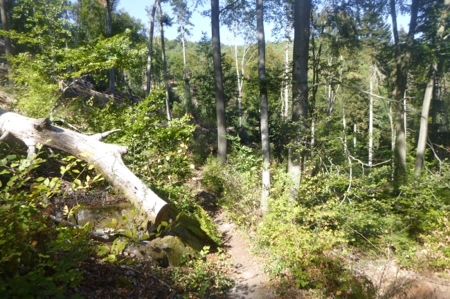 VP Klaustal gibt nochmal alles. Waren die Wege hierher schon bescheiden und steil (auf und ab…), so folgt nun die Krönung. Da sind erstmal die Treppen zum Nonnenfelsen. Na gut, das geht ja noch. Dann ein schmaler Trail, am Hang längs. Stetig hoch, dann flach. Geht auch noch. Den Posten begrüßen, sowieso. Auf breiter Schotterstraße an Hang gegenüber allmählich hoch. Geht auch noch. Aber kurz vor Schlosseck ist Schluss mit lustig. In schmalen Serpentinen geht es steil hoch. Die Ruine ist in der Abendsonne ganz reizvoll, der Trail ziemlich zugewachsen mit Ginster und kleinen Tannen. Und der Einstieg wird auch mal schnell verpasst. Immerhin- es ist erstmal flach und führt zum Nachbarhügel rüber. Da geht dann richtig die Post ab. Der breite Fahrweg tut nur so, als wäre er steil. Der (gut markierte) Trail ist es aber dann wirklich. Brutal. Und dieses Jahr lauert oben eine (echte) Gefahr!