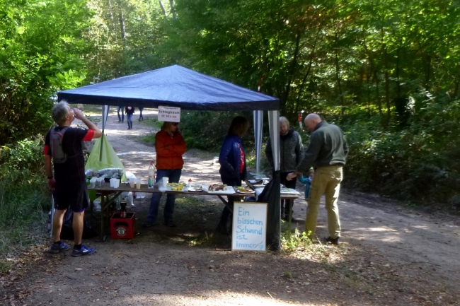 VP 4, die Halbzeit, will erkämpft sein. Ein steiler, schmaler Trail führt gnadenlos aufwärts. Und wer dann durch die Brombeeren bricht, steht auf dem Parkplatz direkt vor dem Nudeltopf! Heiße Nudelsuppe, Streuselkuchen und alles andere noch dazu – ha, die erste Hälfte wäre geschafft. Pause und genießen. Und klönen. Die meisten Helfer sind von der Waterkant extra gekommen!