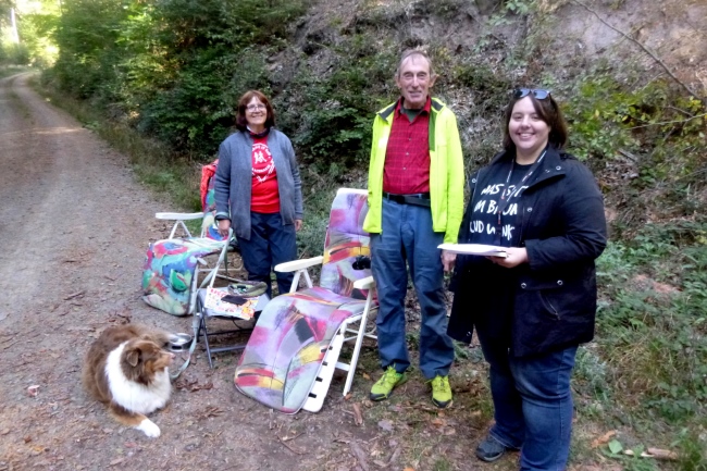 Freundliche Menschen sind schon lange, lange vor uns da, haben Zelte gebaut, Getränke eingeschenkt, Leckerchen hergerichtet. Und wenn wir weg sind, ein leckeres Genießerfrühstück vorbereitet. Eigentlich sollte ich da bleiben. Aber irgendwas zieht mich auf die Strecke. Nur nicht auf die Richtige. Den Abzweig haben wir (in tiefsinniges Gespräch vertieft) klar verpasst. Ein freundlicher Streckenposten leitet uns auf den richtigen Pfad zurück, der zur Burg Battenberg führt. Mann, was hätten wir da abgekürzt. Diese Möglichkeit haben sie noch nicht im Programm. Vielleicht als Variante C …?