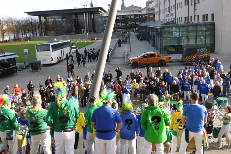 Wir entern den 600m langen Waldschlößchentunnel. Die Rechtschreibreform von 1996 habe ich nicht kapiert. Das Gebiet schreibt man „Waldschlösschen“, den Tunnel und die Brücke aber mit „ß“. Das kann ich mir nicht in den Kopf hämmern. Die Sambaband hämmert wie wild, das hört sich im Tunnel cool an. Je tiefer man kommt, desto mehr wird der Schall reflektiert. Damit beginnt ein kolossaler, betörender Trommelrausch. Grenzwertig, übel, absolut geil. In meinem Bericht von 2015 hatte ich vorgeschlagen, im Tunnel Musik zu machen. Macht also Sinn, dass ich schreibe!