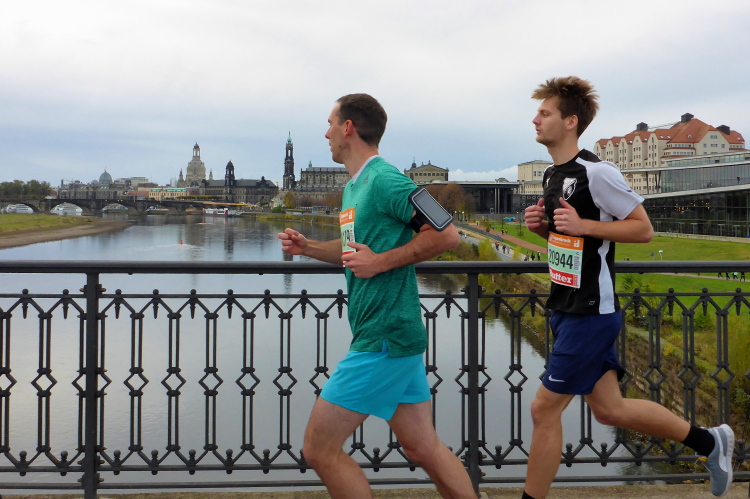 Als ich mich über die Startlinie schiebe, bin ich erstaunt, wie gesittet und langsam die Anfangsgeschwindigkeit ist, habe mich wohl zu weit hinten eingereiht. Für den Blick von der Marienbrücke auf die Altstadt mit Residenzschloss und Kathedrale muss ich mich ziemlich verrenken, aber dank der Ruhe im Läuferfeld kein Problem.