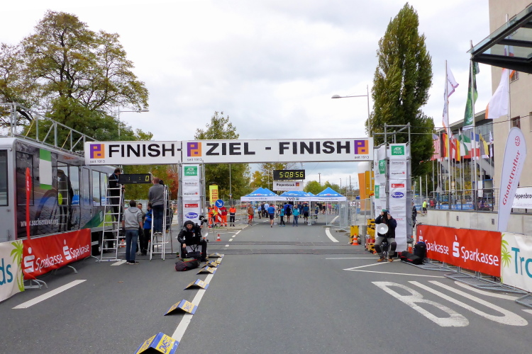 Von oben, von den Brühlschen Terrassen, feuern mich Menschen aus aller Herren Länder an. Das hat was, denn ich bin ja relativ allein auf der Zielgeraden. Vanman Jochen nimmt mir die Einsamkeit. Wir tragen ja alle fünfstellige Startnummern. Das versteh ich schon mal nicht. Und ich verstehe auch nicht, wie Jochen so schnell unsere Namen auf seinem PC findet und die dann noch aufruft. Ok, mich erkennt er schon von Weiten an meinem eleganten Laufstil. Artur, der Zielmoderator natürlich auch. Da bleibe ich stehen und halte einen Vortrag über meine Laufabenteuer und über Bier, wofür ich schon mal 100 Kilometer laufe. Leider gab es kaum noch Zuhörer zu so später Stunde.
