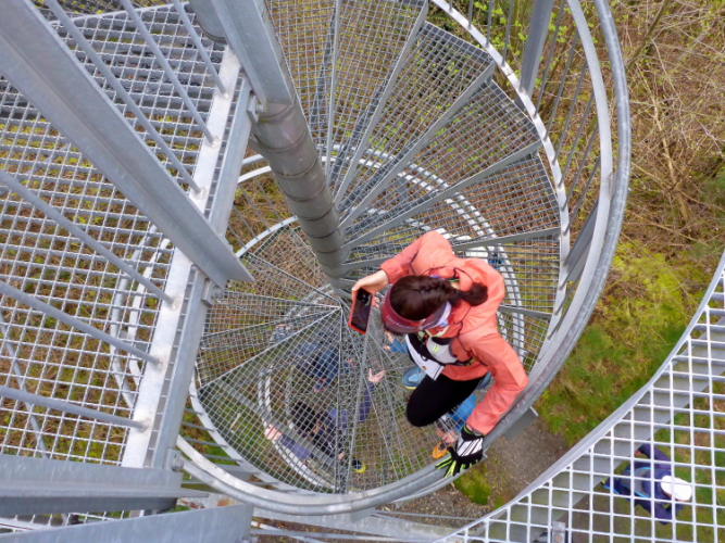 Der nächste Abschnitt sieht aus wie ein Lolly, verläuft in der ersten Hälfte flach und wir haben erneut ein Begegnungsstück. Wir passieren den 7. Kilometer und ich sinniere so vor mich hin, wo denn die 7 km geblieben sind? Das Ergebnis ist einfach: Auf einer sehr abwechslungsreichen und tollen Strecke! Am Aussichtspunkt Nordblick sehen wir nicht viel, es ist zu bewölkt. Dafür bietet dieser die nächste Abwechslung, denn von der Plattform führt uns eine Wendeltreppe senkrecht nach unten. Der weitere Weg steigt leicht an und wir laufen den Lolly zurück. Am Ende der Begegnungsstrecke geht es scharf links rum, und ein Weg führt uns runter ins Tal, teilweise mit Treppen etwas steiler.