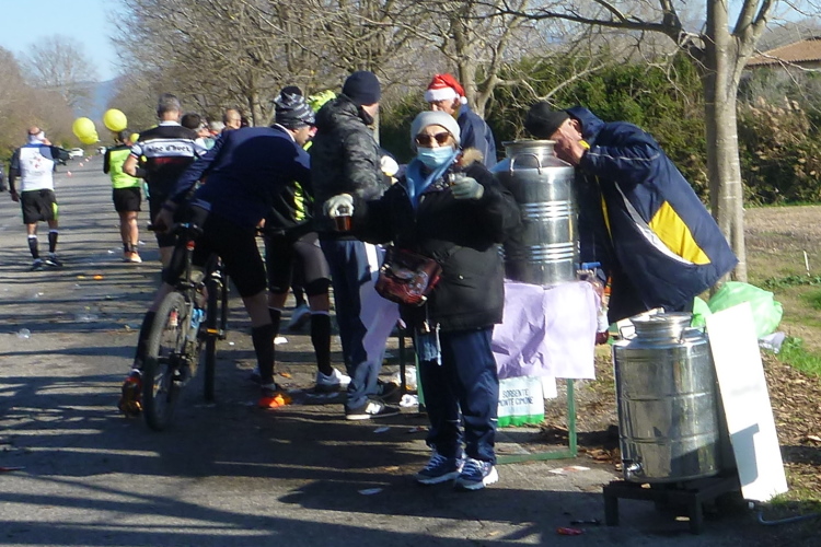 Ich laufe auf Florian auf, mit dem ich, noch bevor wir wieder Stadtgebiet betreten werden, eine Laufgemeinschaft für die letzten zehn km bilde. Geteiltes Leid…, nein Quatsch, das ist es wirklich nicht, aber gemeinsam läuft es sich bei munterer Unterhaltung doch sehr viel netter. Jetzt ist auch der Arno wieder klar zu erkennen, dem wir seit Marina di Pisa parallel folgen bzw. besser gesagt entgegenlaufen. Der warme, süße Tee, den ich gemeinsam mit Wasser auch hier zu mir nehme, ist ein echter Segen. Ein langer Autostau entsteht wegen uns, doch auch bei denen ist die Anteilnahme gleich null. Eine tolle Ausnahme bildet der eine mit Jungvolk besetzte Wagen, aus dem heraus lautstark angefeuert wird. Am gegenüberliegenden Ufer leuchtet schon wieder der Torre Ghibellina, Teil der ehemaligen Zitadelle, den wir schon nach dem Start ausgiebig bewundern durften.