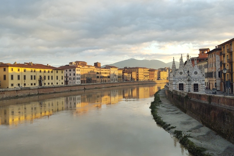 Sämtliche Zug- und Bremsläufer von 3 bis 5 Stunden befinden sich vor mir, als auch ich los dackele. Über eine piniengesäumte Straße streben wir in Richtung Arno, den Pisa durchquerenden, mit 241 km achtlängsten Fluss Italiens. Nicht nur mich rettet nach etlichen Metern entlang der Stadtmauer der erste buschbewachsene Grünstreifen, den ich bald wieder deutlich entspannter verlasse. Was jetzt kommt ist, darauf bin ich vorbereitet, die Schokoladenseite der heutigen Strecke. Eine lange, wunderbare Häuserzeile zur linken, den Arno zur rechten, die Apenninen am Horizont voraus, das hat etwas. Ich komme mit Rainer von den LSF Münster ins Gespräch, den ich schon häufig im In- und Ausland getroffen habe. Er will es heute noch ruhiger als ich angehen lassen, daher ziehe ich nach ein paar warmen Worten langsam davon. Die Pipipause hat mich natürlich weitere Zeit gekostet, sodaß ich mich ziemlich weit hinten im Feld bewege. Vorbei am Nationalmuseum, der Uni (40.000 der 90.000 Einwohner sollen Studenten sein) und weiterer attraktiver Fassaden erreichen wir die Ponte della Fortezza, auf der wir den Arno überqueren und auf dieser Seite den Rückweg antreten. Hier ist es noch schattig und etwas frisch, während die Gegenseite im schönsten Sonnenschein glänzt.