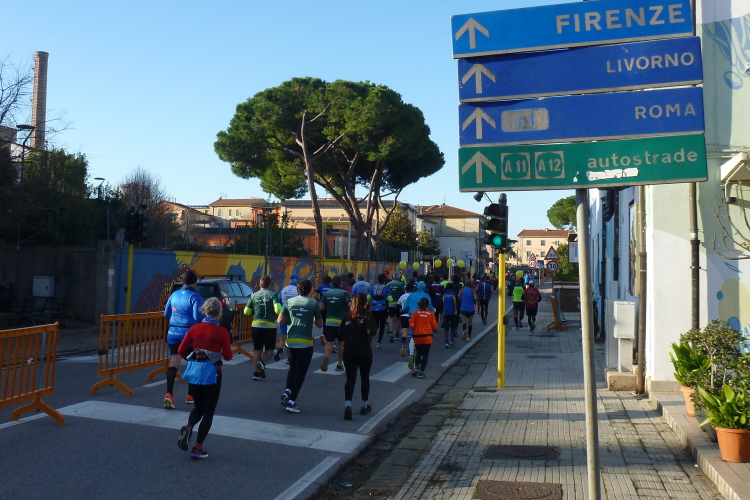 An km 12 erfolgt die Streckenteilung der gemeinsam gestarteten Halb- und Marathonläufer. Letztere setzen ihren Weg fort, die Halben treten nach einem scharfen Knick über eine Parallelstraße den Weg zurück nach Pisa an. Ewig weit geht mein Blick auch hier nach vorne, gut, daß ich damit kein Problem habe. Auch nicht mit dem schon dritten VP, der das volle Programm aus warmem (!) Tee, Wasser, Orangen, Bananen, Zucker und Keksen bietet. Gleichermaßen Auge und Herz erfreut ein Pinienwäldchen, das uns für die nächste Zeit verschluckt, bevor wir einen größeren Militärkomplex streifen und nach einer weiteren langen Gerade den Badeort Tirrenia erreichen. Auch er gehört zur Stadt Pisa und wurde vom Duce gegründet. Viele Architekten aus ganz Italien bauten hier Waisenzentren und Häuser für Reiche. Ich bin weder das eine noch das andere, also weiter. Bald darauf erreichen wir unzweifelhaft das Meer, das wir aber noch nicht sehen können.