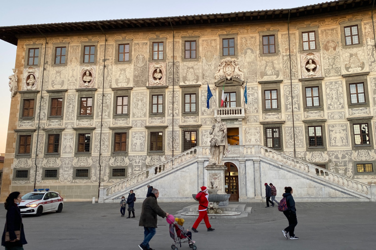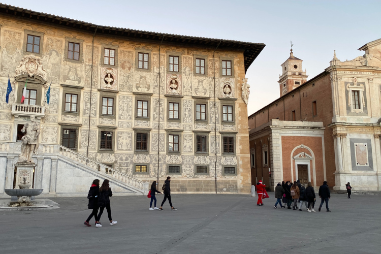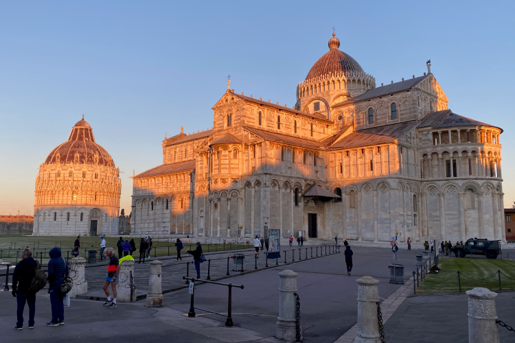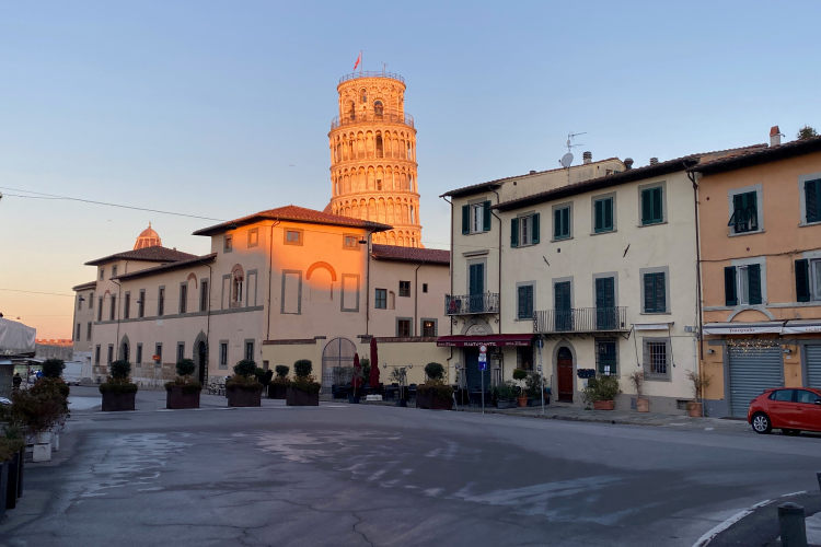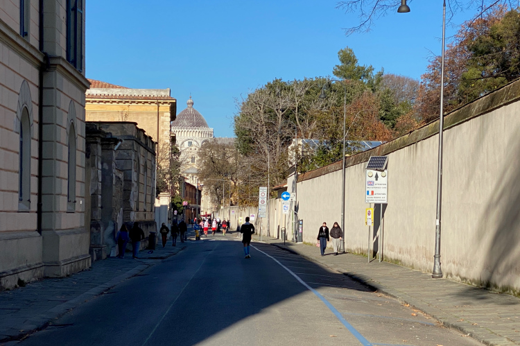 Pünktlich um 9:00 Uhr geht es los. Über die breite Via Bonanno Pisano laufen wir Richtung Arno. Dort an der Stadtmauer drehen wir nach links. Zwischen uns und dem Fluss steht der mittelalterliche Torre Guelfa. Die Häuser am Arno strahlen golden in der aufgehenden Sonne. Der Palazzo alla Gironata ist der Sitz des Rektorats der Universität. 49.000 Studenten gibt es hier an mehreren Lehranstalten. Darunter auch zwei sehr renommierte Eliteschulen, die Scuola Normale Superiore (270 Studierende) und die Scuola Superiore Sant'Anna (1.600 Studierende). Ein gewisser Galileo Galilei hat seine wissenschaftliche Laufbahn in Pisa begonnen.