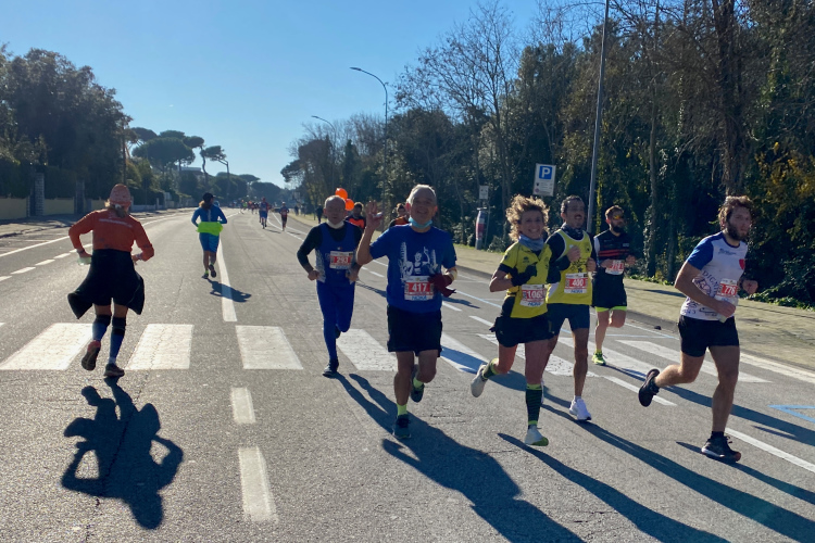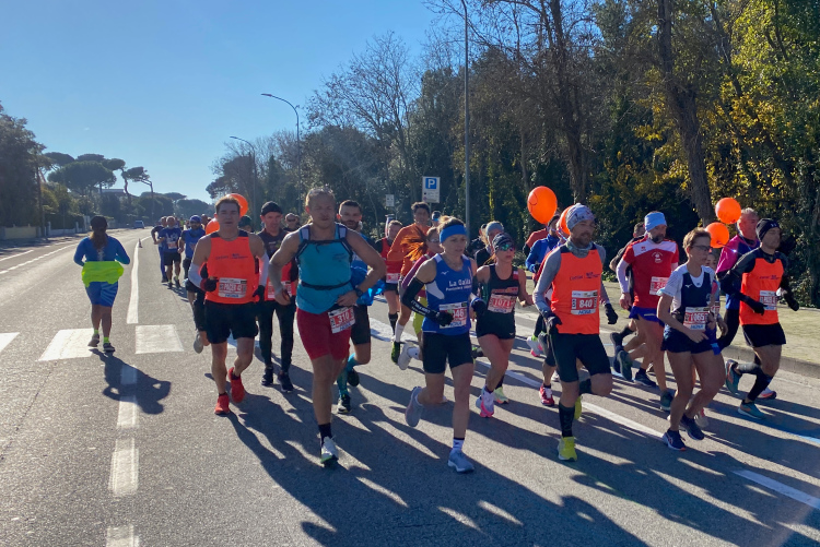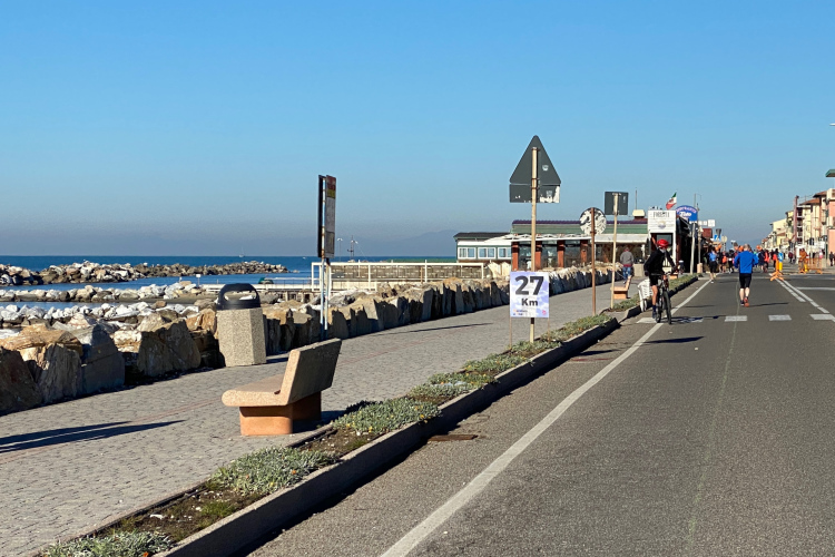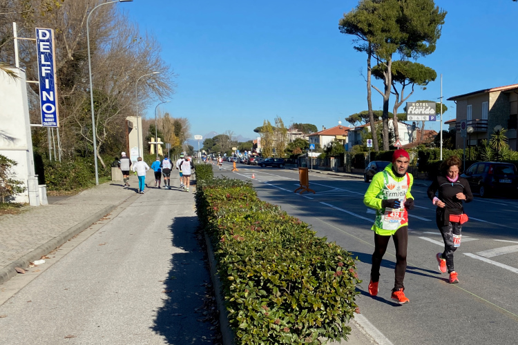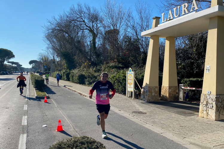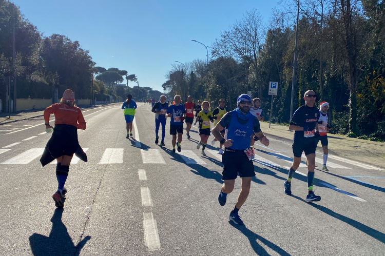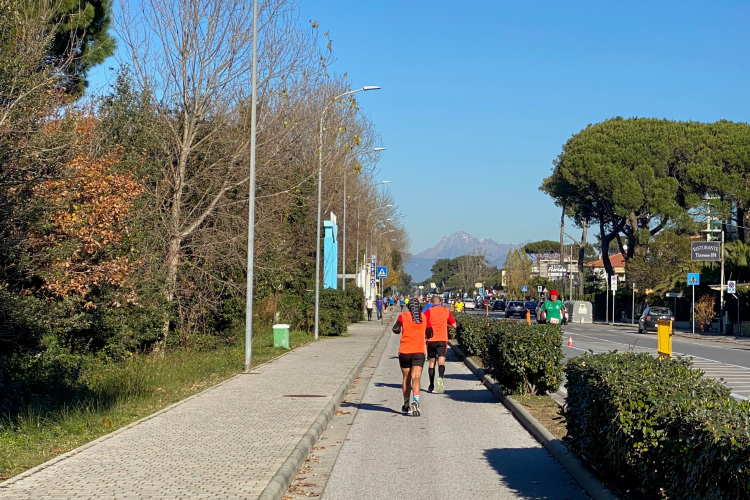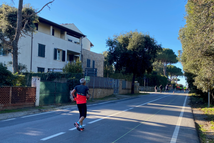 Nächste Abwechslung beim Erreichen der Küste in Tirrenia nach km 18: Wir laufen nach links und finden uns auf einer Begegnungsstrecke wieder. Mal sehen, wer da alles schneller ist. Links in den Pinien liegen Ferienhäuser, rechts die Bagni und Lidi (Badeanstalten) mit einem Pinien-Park vor dem Sandstrand. Auch für die Militärs und Carabinieri ist hier ein Strandabschnitt reserviert. Keine Betonklötze, wahrscheinlich auch im Sommer sehr schön. Inzwischen ist es mit 10 Grad richtig warm geworden. Ein kühlender Wind fehlt. Uns kommen allerlei Pacer mit großem Gefolge entgegen. Kurz nach dem Halbmarathon die Wendestelle, hier sind wir schon recht nah bei Livorno.