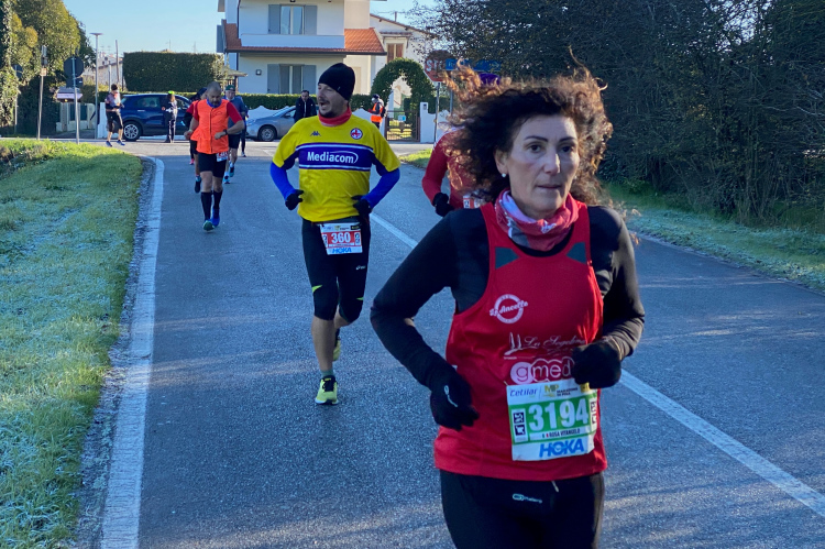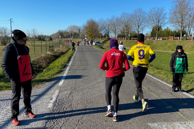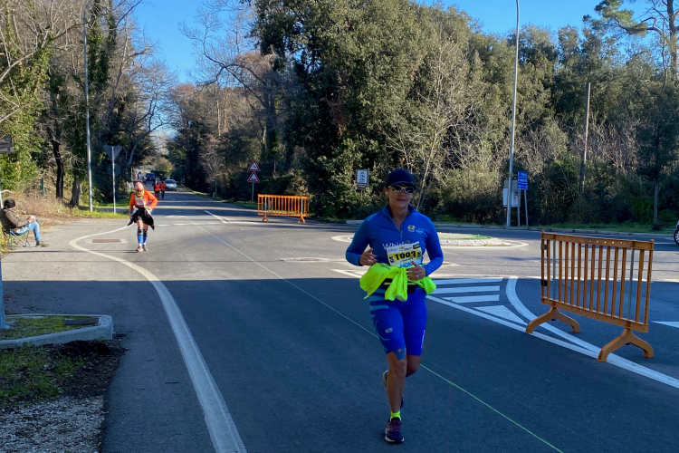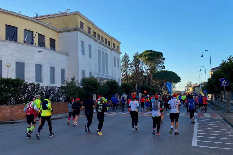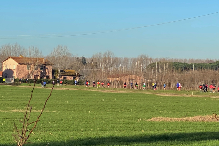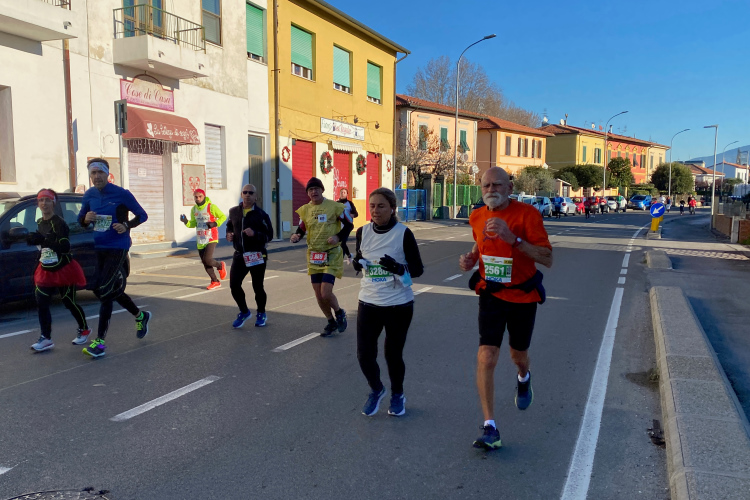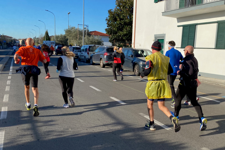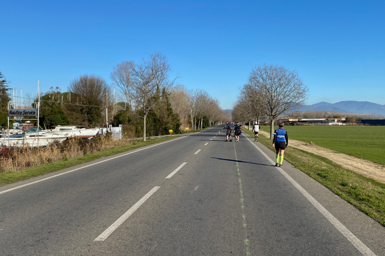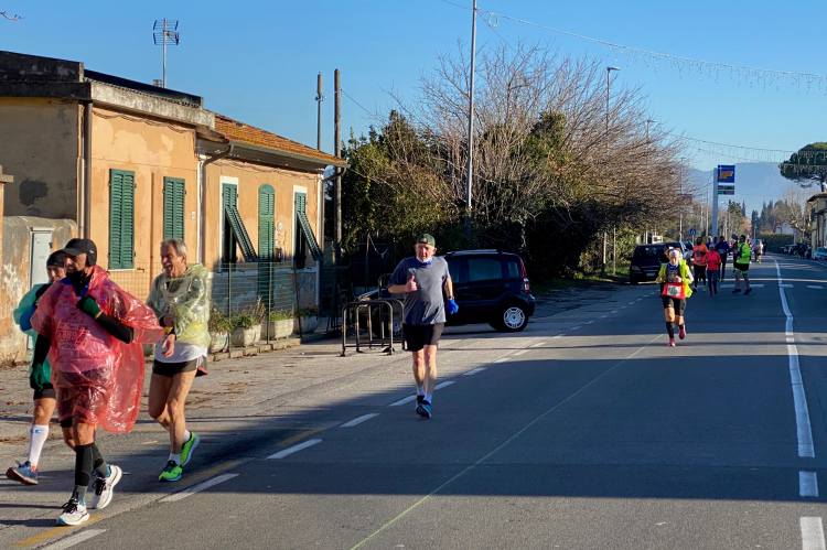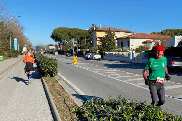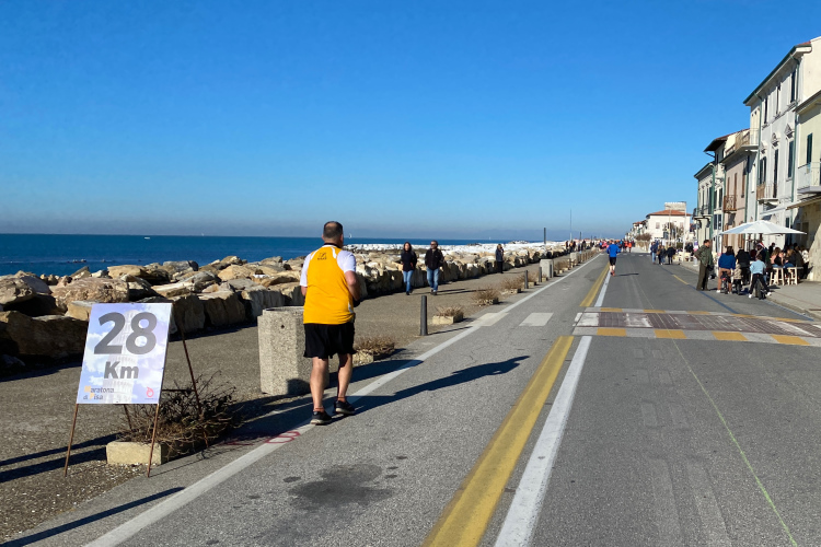 Kurz vor der Arno-Mündung biegen wir rechts ab. Jetzt geht es 10 km in Richtung Pisa. Den Fluss sieht man nur selten. Dafür viele Segelboote und Jachten. Die Straße ist nur einseitig gesperrt, der Gegenverkehr ist überschaubar. Ich bin nicht mehr so fit und ärgere mich über die Radler, die an mir vorbeifahren. Weiter vorne bei der Pacergruppe gibt es gelegentlich Wortgefechte, wenn sie sich durchquetschen. Aber das ist in Italien Standard, eine Laufveranstaltung hält Radsportler nicht auf. Und ein Autofahrer, der unerlaubt auch in Laufrichtung unterwegs ist, schneidet mich knapp, als er dem Gegenverkehr ausweicht. Eine Schrecksekunde, als mich der Rückspiegel fast erwischt. Aber wahrscheinlich bin ich nur frustriert, da ich mein Tempo nicht mehr halten kann.