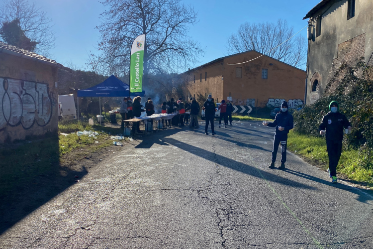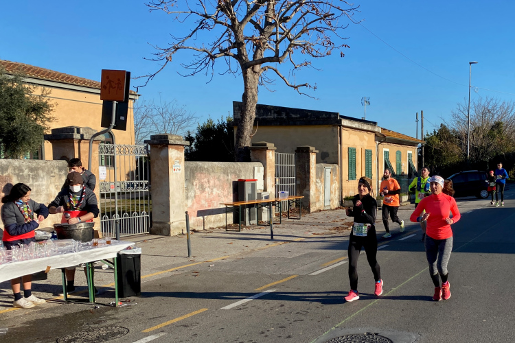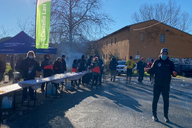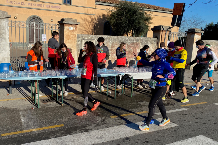 Kurze Zeit später geht es durch die Porta a Mare, Teil der antiken Stadtmauer, und nach 5 km haben wir Pisa hinter uns gelassen. Die erste Verpflegungsstelle wartet auf uns. Noch gibt es nur Wasser. Bei km 39,5 kommen wir wieder hierher. Es folgt eine Straße, gesäumt von unzähligen kleinen Häusern. Wir laufen ein paar Kilometer zwischen diesen Häusern, dahinter sind Felder. Gelegentlich finden sich ein paar Zuschauer ein.
