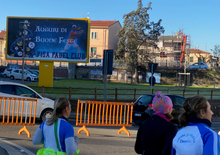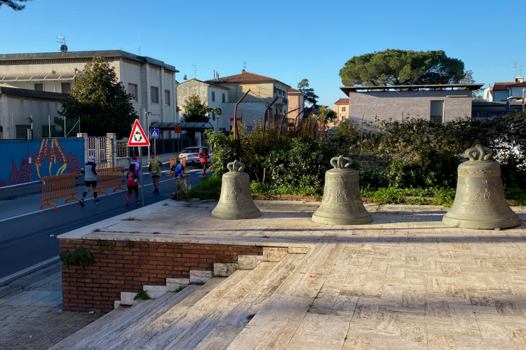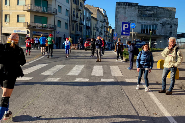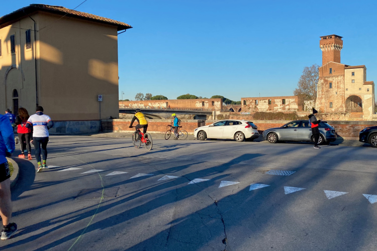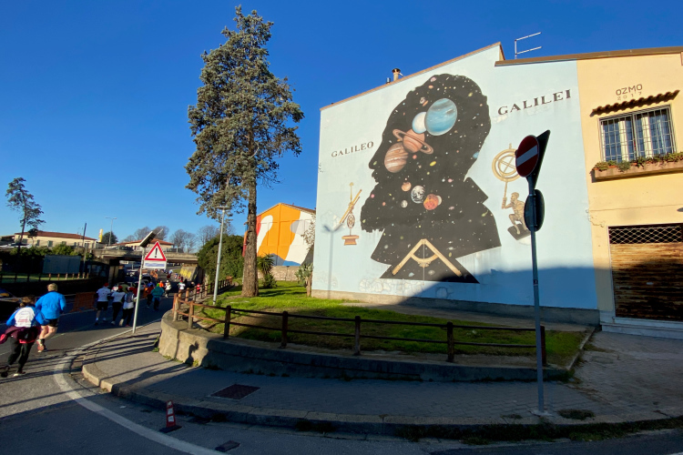 Die Kilometer ziehen sich dahin. Rechts sieht man über die Felder. Eine größere Kreuzung ist gut von der Polizei gesichert. Dann der VP 39,5 km. Kurzes Anhalten für ein Wasser, dann hinein in die Vorstadt. An der Bastione Stampace vorbei über die Ponte della Cittadella. Der Schiefe Turm erscheint recht weit entfernt. Am Arno ein Stück entlang, dann links auf die Via Roma, eher ein unscheinbares Sträßchen. Aber nicht direkt weiter, erst muss noch ein Häuserblock umrundet werden. Doch es stehen ja überall Helfende und die Laufstrecke ist mit grünem Strich perfekt gekennzeichnet. Da kann man nicht falsch laufen.