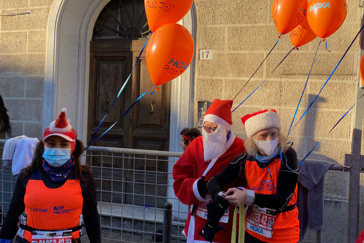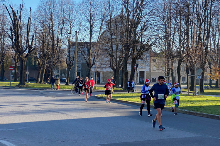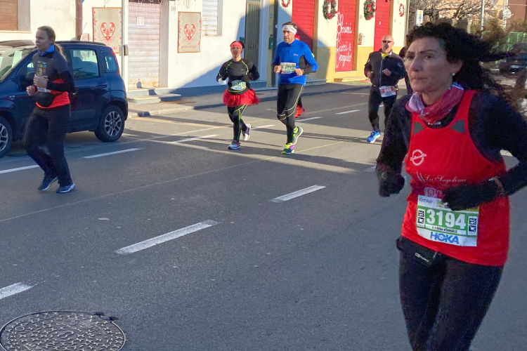 Die Piazza Garibaldi mit entsprechendem Standbild liegt an der Ponte di Mezzo und markiert den Beginn der Gässchen auf der nördlichen Arnoseite. Für uns geht es noch an zwei weiteren Plätzen mit obligatorischem Weihnachtsbaum vorbei. Dieser ist hier stets mit blinkenden Lämpchen versehen, anscheinend geht der Trand zu weißen Birnen. Farbiges Material ist nicht mehr oft zu sehen. Auch wiederverwendbare Plastikbäume scheinen im Wohnzimmer oder auf dem Balkon nicht verpönt zu sein. Dafür sind die „offiziellen“ Bäume auf den Piazze dann meist echt. Vor uns kann man die Läuferschar auf der Ponte della Fortezza erkennen. Die Festung von San Gallo werden wir nicht sehen, da wir auf der südlichen Arnoseite wieder zurücklaufen.