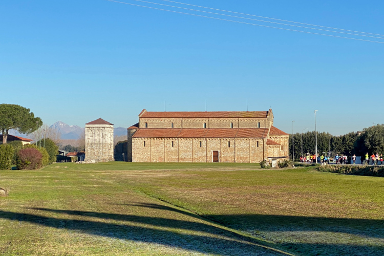 Am Ende der Häuserkette taucht eine auffällige romanische Kirche auf, die wir in einem U umlaufen. Es ist die Basilika San Piero a Grado. Hier soll der heilige Petrus das erste Mal italienischen Boden betreten haben. Früher begann hier schon das Meer.