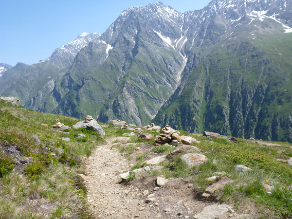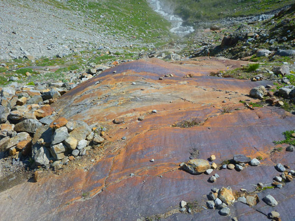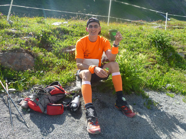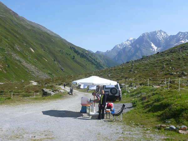 Rostbraun bis Dunkelrot glänzen Felsplatten des Gneis, der vorherrschenden Gesteinsart in den Ötztaler Alpen, in der warmen Sonne. Große Steinplatten und riesige Felsbrocken in diversen Rottönen sind am und auf dem Laufweg. An der dritten Labe lege ich eine kleine Pause ein, Jan kann ich bergab nie und nimmer einholen. Mein jetzt schon schwer verdientes drittes Kreuzchen auf die Startnummer lasse ich mir natürlich nicht entgehen.