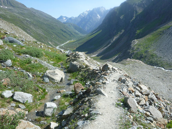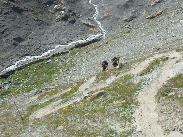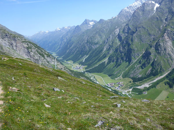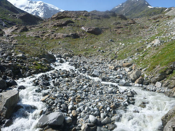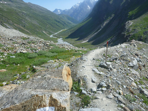 Die Labestation ist einiges weiter unten am Materiallift der Hüte aufgebaut, bis dahin gilt es noch ein gutes Stück zurückzulegen. Ein Akkuwechsel zwingt mich zu einer Pause. Als ich fertig bin, ist Jan längst über alle Berge. Über die Moränenhänge des Taschachferners steigt man ab in das ehemalige Gletscherbett. Die gewaltige Dimension des Eises, das hier in unwahrscheinlich kurzer Zeit abgeschmolzen ist, kann man nur erahnen. Abschnittsweise fühle ich mich auf die Eiger-Moräne beim Jungfrau Marathon versetzt. Allerdings mit zwei krassen Unterschieden: Hier geht es abwärts und vor allem, ich bin ganz alleine unterwegs. Ein Wunschtraum auf der immer völlig überfüllten Eiger-Moräne. Es ist richtig geil hier, auch wenn der Abstieg alles andere als leicht ist.