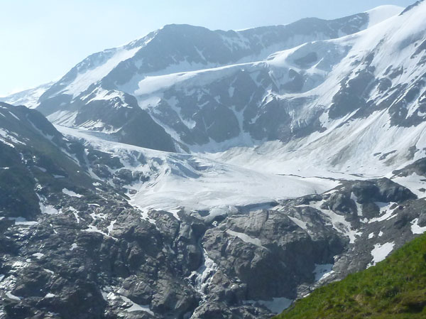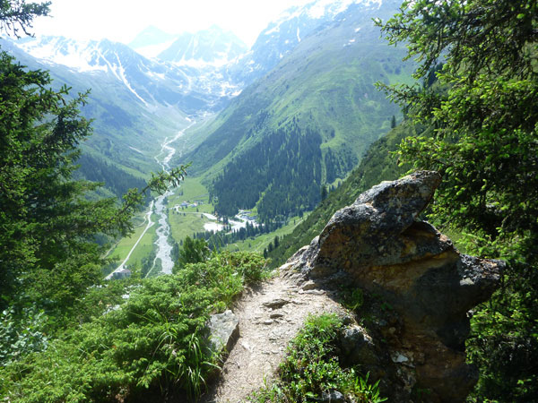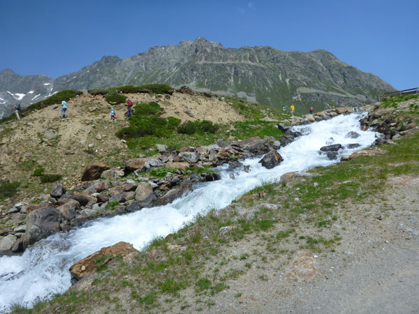 Eine Brücke führt uns über den wild rauschenden Gletscherbach des Sexegertenferners hoch zum Taschachhaus auf über 2.500 m, nur ein paar hundert Meter unterhalb der Gletscherzunge. Den packenden Blick auf die Eisbrüche des Taschachferner können wir hier aus nächster Nähe genießen. Die Entstehung der Gletscher spielt sich oberhalb der Schneegrenze im Gipfelbereich der Hochgebirge ab. Die nicht abtauenden Schneemassen verdichten sich zu Eis und bewegen sich ca. 100 m im Jahr talwärts. Der zungenförmige Eisstrom schmilzt unterhalb der Schneegrenze ab und bildet eine gewölbeartige Öffnung, das Gletschertor, aus dem der Gletscherbach entspringt.