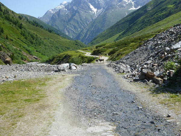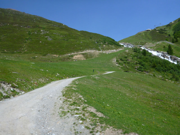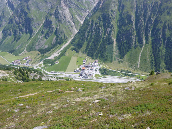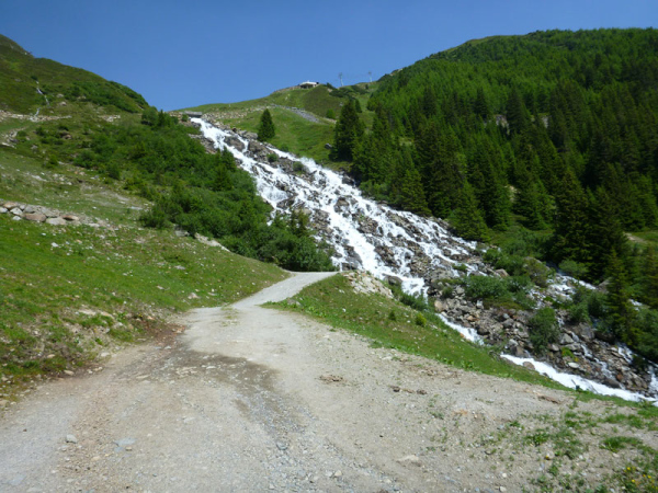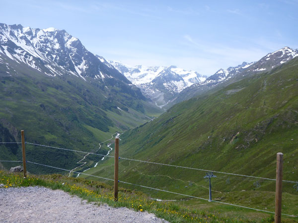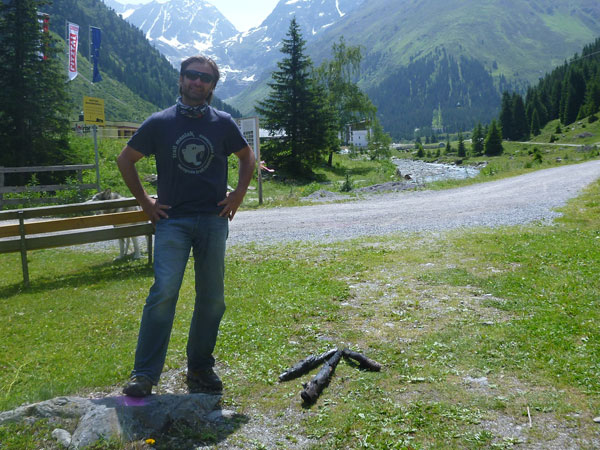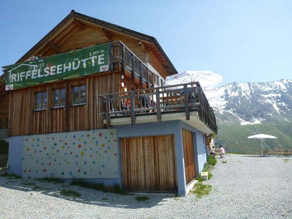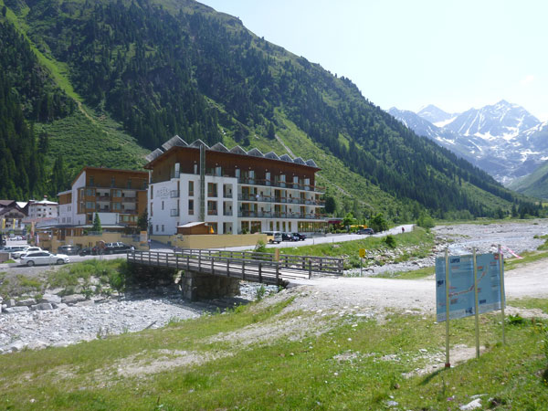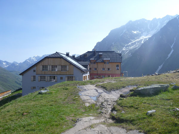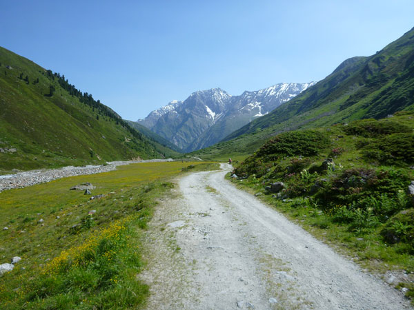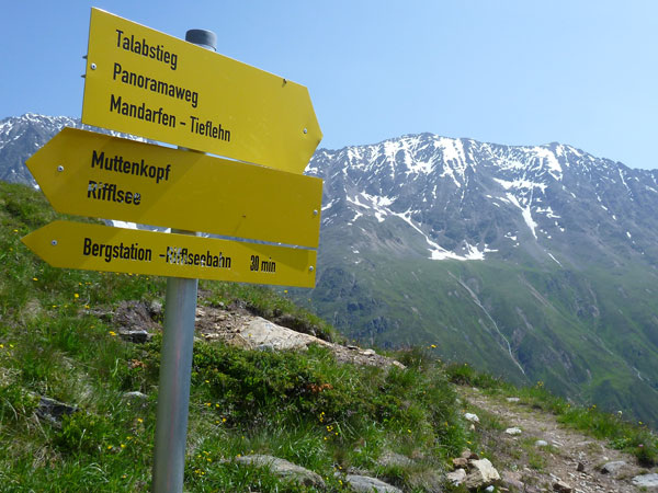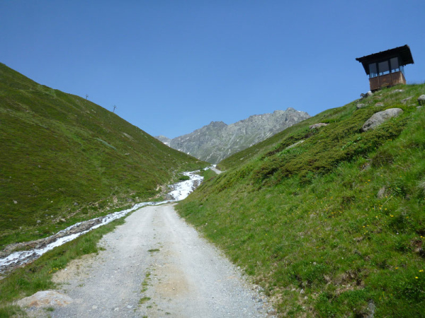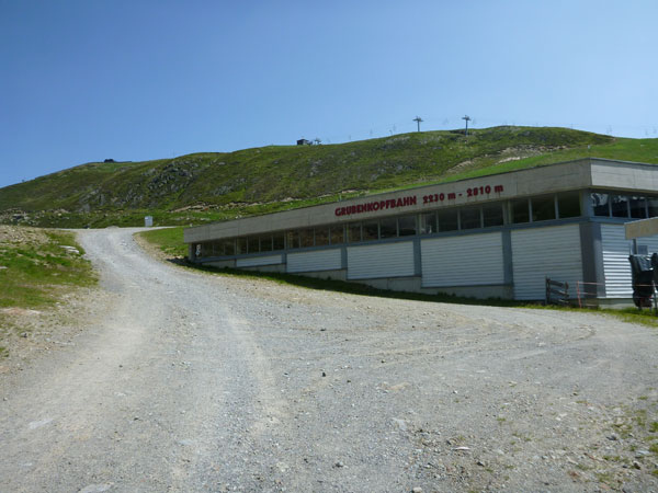 Die breite Schotterstraße führt über die Grubenkopfbahn hinauf zur Rifflseehütte. Wir haben schon Schöneres und Aufregenderes heute unter den Füßen gehabt. Ursprünglich stand der Aufstieg auch nicht auf dem Plan, vermutlich ist es ein Abschnitt der eingeschoben werden musste, um uns mit den nötigen Höhenmetern zu versorgen, da die Gletscherüberquerung ja wegfällt. Nur wenige Serpentinen kann die Straße aufweisen, das macht den Aufstieg teilweise derart giftig, dass es mir fast die Luft aus den Lungen saugt. 500 Höhenmeter auf nur 4 Kilometer machen mir in der prallen Sonne schwer zu schaffen. Unbarmherzig geht es durch bis zur Hütte. Jan war auch völlig fertig und ist eingekehrt für einen Cappuccino und einer leckeren Speckknödelsuppe. Ich habe aber leider immer noch keinen sonderlichen Appetit. Nur ganz knapp haben wir uns verpasst.