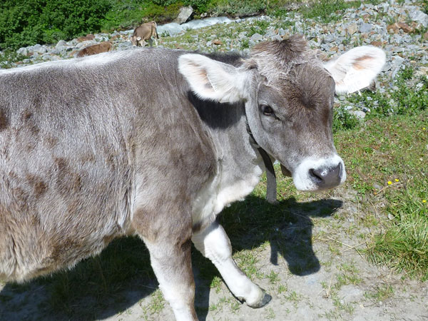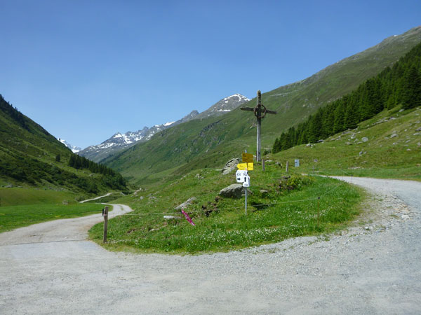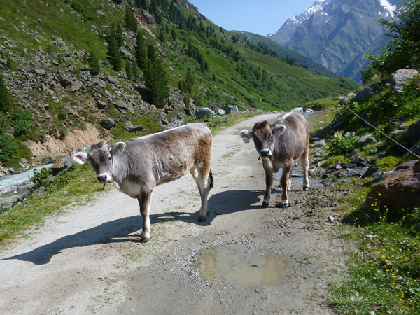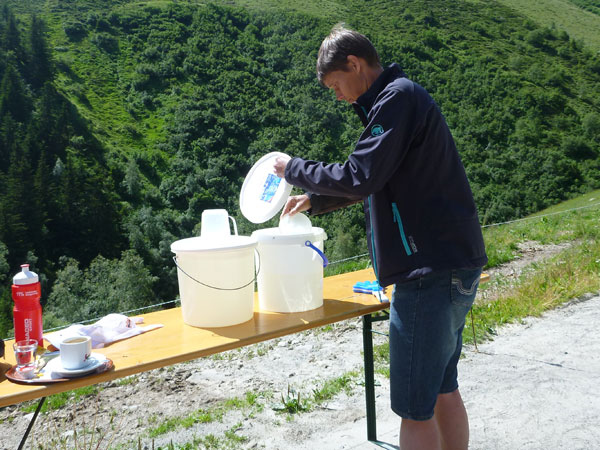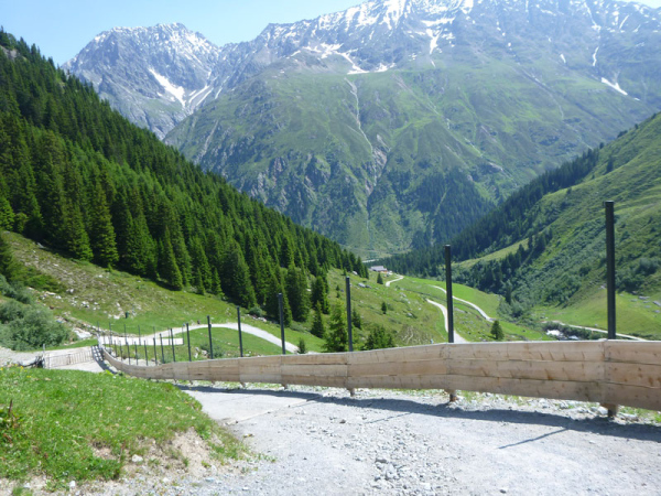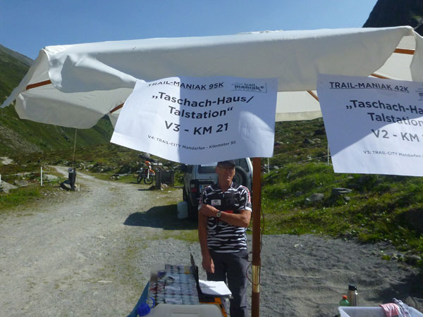 Ab VP führt ein bequemer Forstweg über 6 km runter zur Taschachalm. Unterbrochen wird der Downhill von einigen Viehgattern, die zu öffnen sind. Oft fühlen sich die Rindviecher gestört, brüllen laut und rennen davon. Ich will nichts herausfordern und nehme lieber jedes Mal Tempo raus. Für die 42K-ler sind es an der Alm nur mehr wenige hundert Meter bis zur Zwischenstation in der Trailcity in Mandarfen. Mit uns meint es die Rennleitung besser. Ab Taschachalm jagt man uns fast senkrecht den Berg hinauf zur Rifflseehütte. Vorher kann aber noch an einer Getränkestation Hollundersaft getankt werden.