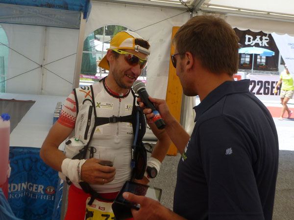 Nach 8 Stunden bin ich wieder im Verpflegungszelt in Mandarfen zurück. Jan macht sich nach einer Stärkung gerade auf den weiteren Weg. B‘jak gibt an Position 3 liegend ein Interview, er fühlt sich nicht optimal. Mir geht’s nicht viel besser, mir ist auch leicht übel. Dabei sollte ich mich jetzt eigentlich ausgiebig verpflegen. Aber irgendwie habe ich schon den ganzen Tag keine Lust auf Essen. Obwohl ich sonst derlei Probleme nicht kenne und eigentlich alles und viel verputzen kann. Mit Mühe kann ich mir eine Suppe reinwürgen. Verena sieht mir vielleicht was an, fragt mich, wie’s mir geht. Alles ok, nur nicht den schwachen Mann markieren. Am Schluss werde ich noch aus dem Rennen genommen. Nach 15 Minuten geht’s weiter.