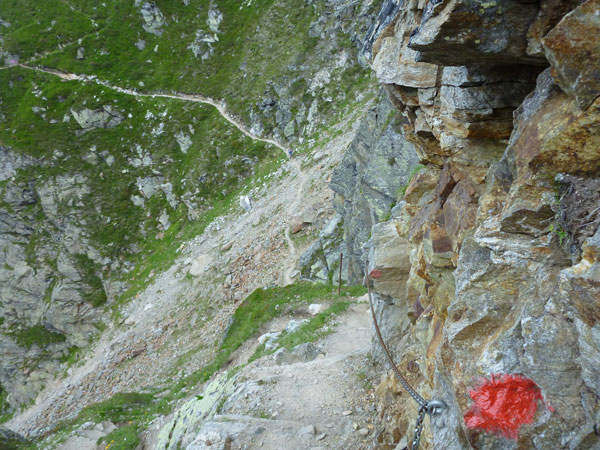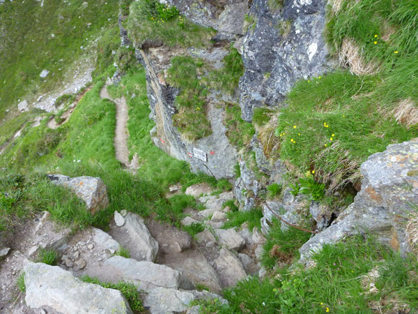 Murmeltiersteig C, Steinbocksteig C+ – D+ sind die nächsten Kriterien, die es zu überwinden gibt. Mir sind die Schwierigkeitsgrade kein Begriff und sie sind mir auch im Moment völlig wurscht, es ist definitiv sauhart. Der Steig ist optisch eine Wucht, immer öfters sind jetzt Abschnitte mit Stahlseilen gesichert. Es ist kein Spaziergang, hier werden auch Hochkaräter nach 40 km Anlauf und 2.000 Höhenmetern in den Beinen nicht La Paloma pfeifend aufsteigen. Mario nennt das hier Alpine Running.