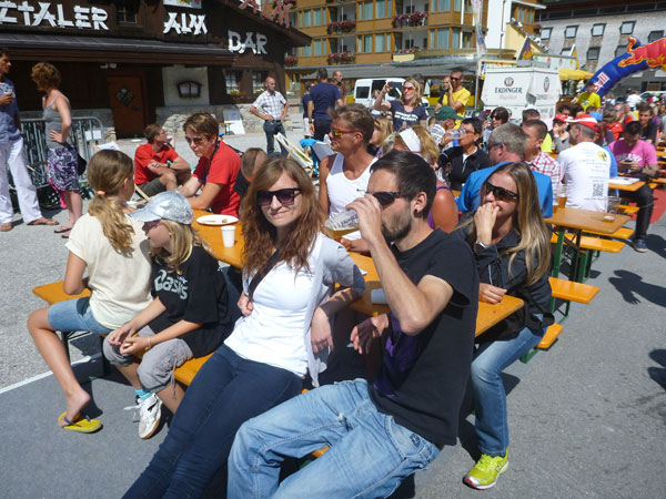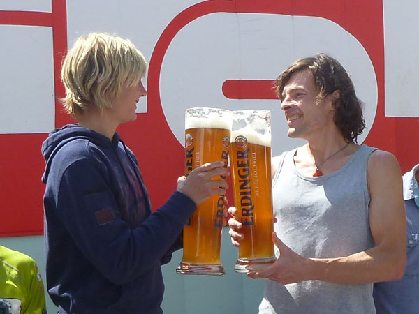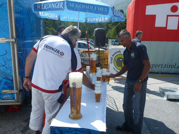 Zur Siegerehrung am Sonntag gibt es für alle noch Weißwurstfrühstück und das beliebte Erdinger Alkoholfrei, wieder unter strahlend blauem Himmel. Auf das Podest dürfen heute zu recht alle 11 Finisher des 95K und auch jene, die innerhalb der Cut Off-Zeiten an den Ausstiegsstellen blieben. Sie sind wirklich wahre Tough Guys im Alpine Trailrunning.
