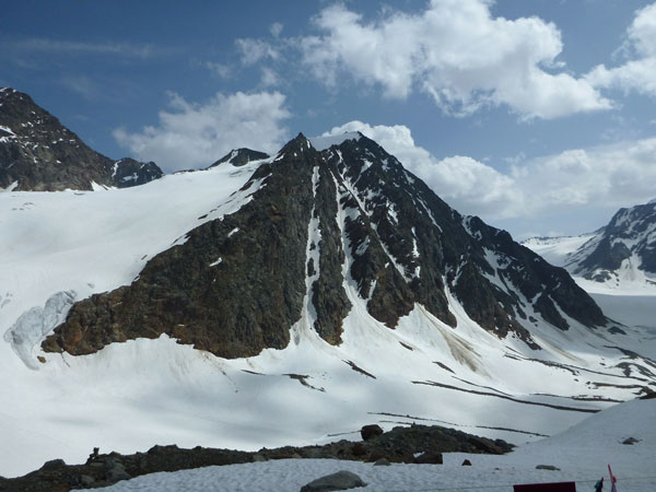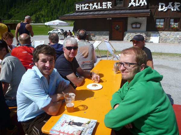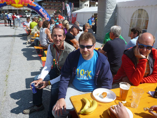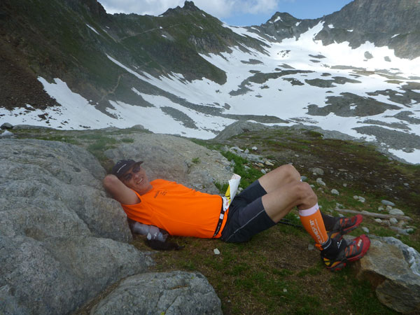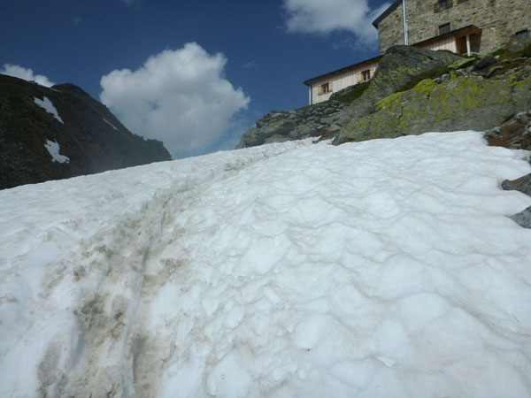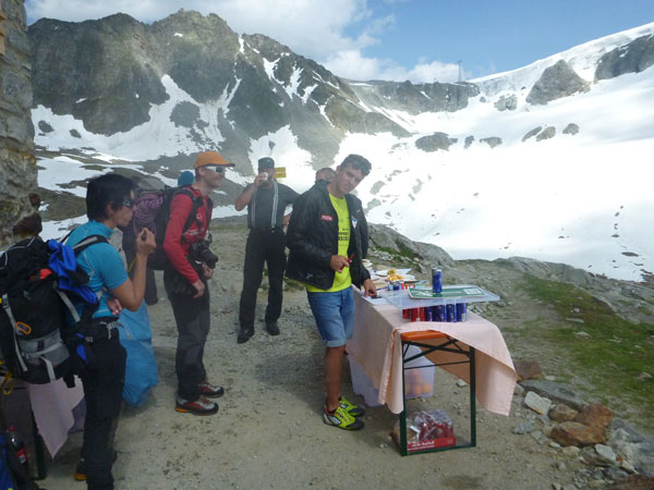 Auf einem Schneefeld, mit Hütte im Visier, kommt mir Jan entgegen. Mein Entschluss aufzuhören steht fest und ich teile ihm das mit. Jan meint nur: „Ich bin schon tot“. Auf 2.759 m liegt die Braunschweiger Hütte. Erbaut wurde sie bereits 1892 und später noch zweimal erweitert. Sie ist die höchstgelegene Unterkunft auf dem Fernwanderweg E5. Direkt davor ist unsere Versorgungsstation aufgebaut. Mir ist übel. Ich vermute, es liegt an der Höhe. Ich würge mir ein Gel rein und zwei Dosen Red Bull. Dazu 20 Minuten Pause im Liegen in der Sonne. Eile ist nach meiner Entscheidung jetzt keine mehr geboten.