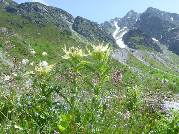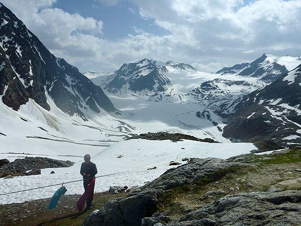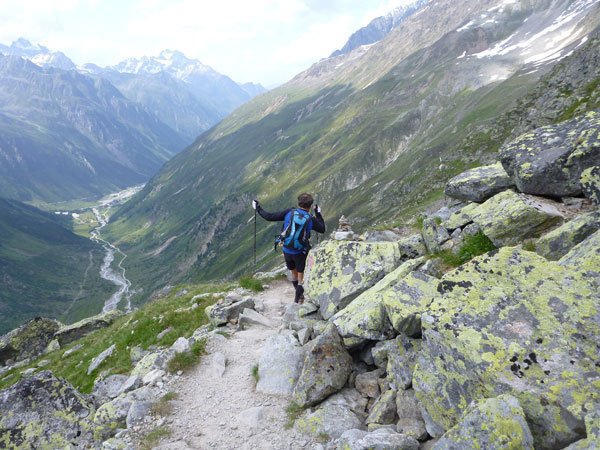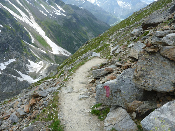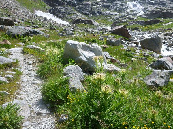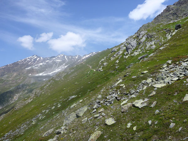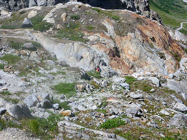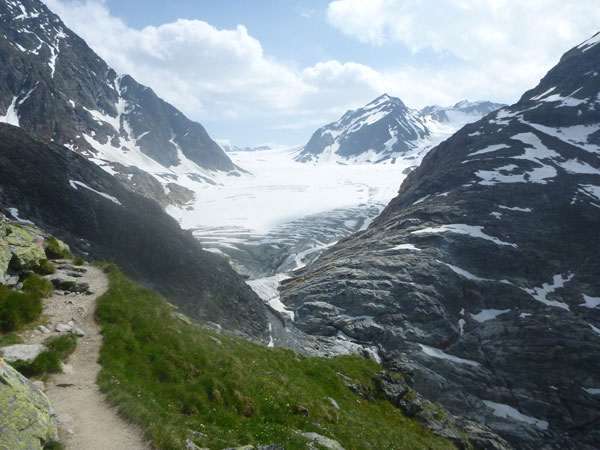 Über Steilstufen, Felsblöcke jeder Größe, Felsplatten, bunte Moose, Alpenrosenfelder und zwischendrin auch mal Enziane, geht es mühsam Stück für Stück empor in ein kleines Kar. Plötzlich wird um eine Ecke der Blick auf den riesigen Gletscher frei. Atemberaubend schön. In ein paar Jahren schon könnte dieser Anblick bereits dem Klimawandel zum Opfer gefallen sein. Auch die Planen, mit denen die Gletscher im Sommer teilweise bedeckt werden, können deren stetigen Rückgang nur sehr begrenzt aufhalten. Es wäre im Übrigen unser Preis gewesen. Die schmutzig-graue Gletscherzunge des Mittelbergferners gilt es in der Originalstrecke zu überqueren.