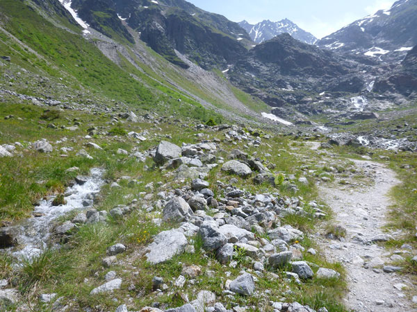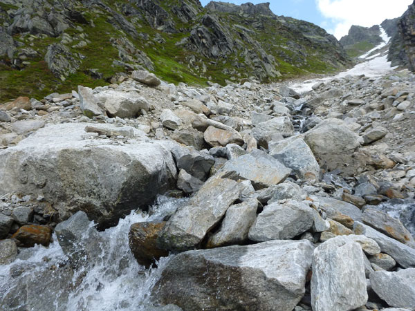 Ein Almenweg und eine Forststraße führen uns ins Gries, dem obersten Abschnitt des Flusslaufs der Pitze. Von oben kommen mir auf dem Begegnungsstück immer wieder die Verfolger des Führungstrios entgegen. Nicht dramatisch, aber immer leicht steigend geht es bis zum Beginn des Felsengeländes. Ab hier gibt es bis oben rauf nur mehr Steine. Die spürbar intensivere Sonneneinstrahlung lässt mich des Öfteren das herrlich klare und eiskalte Wasser der Pitze kosten, schmeckt besser als die laufwarme Brühe in meiner Plastikflasche. Mario hatte recht und Kühe sind auch nicht in der Nähe.
