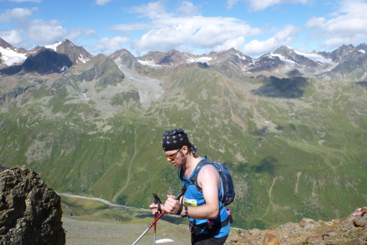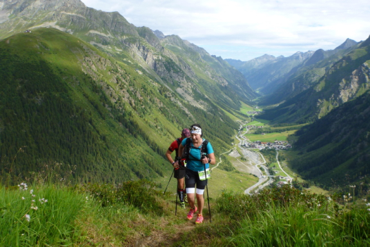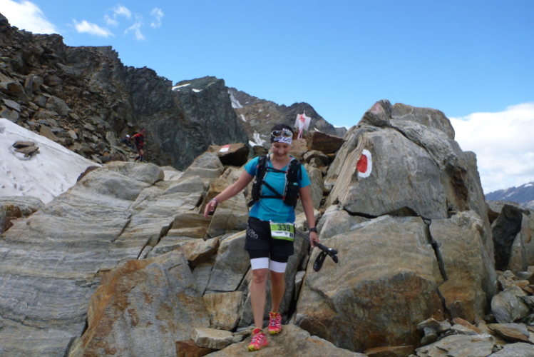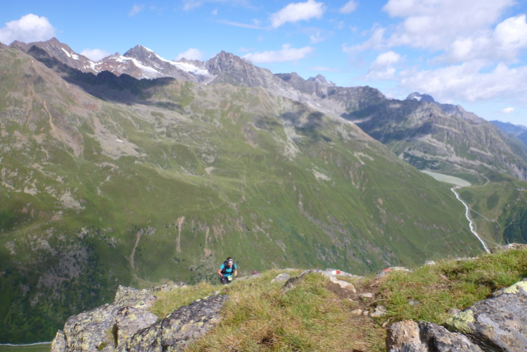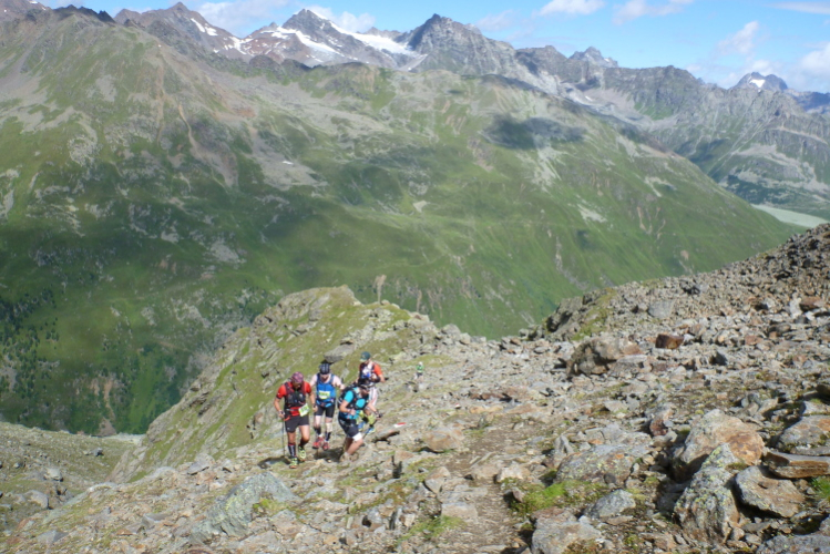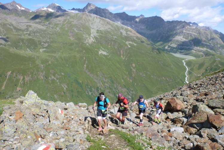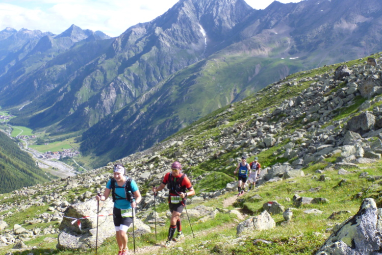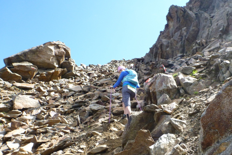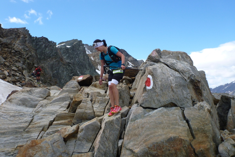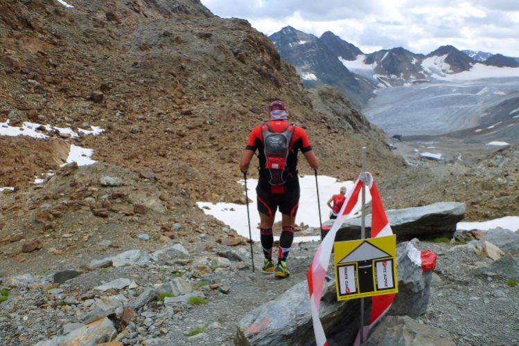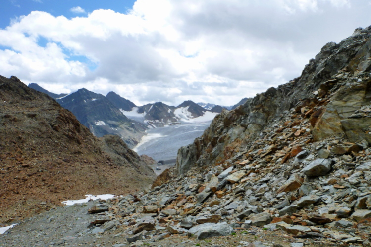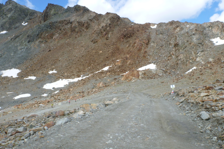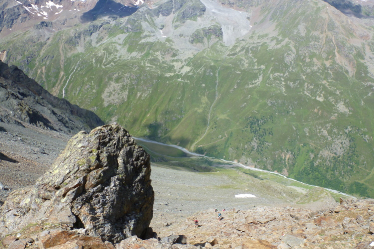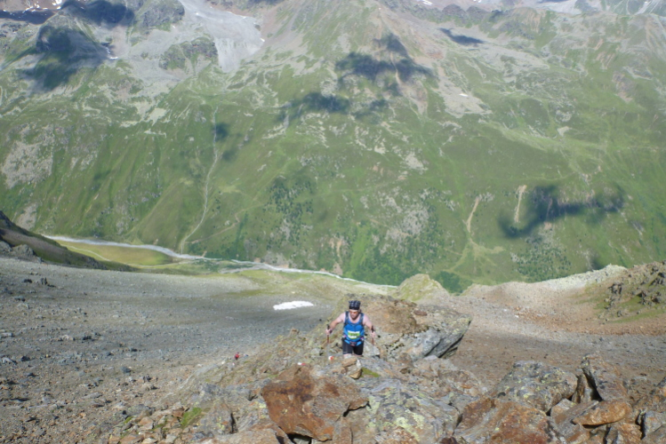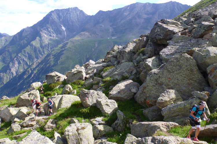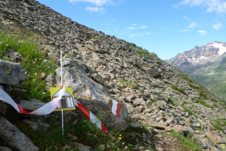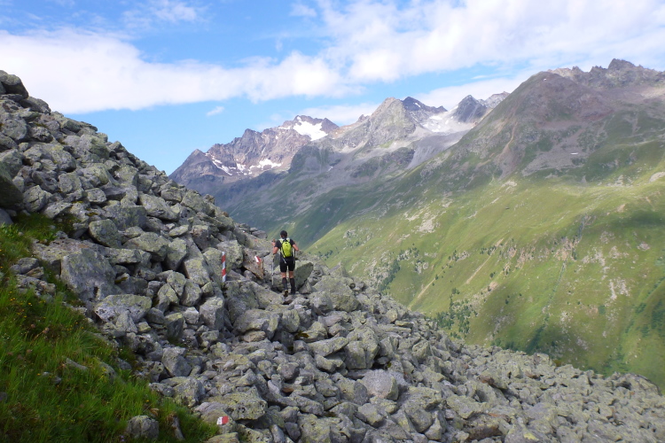 Später schwenkt der Pfad ein wenig nach rechts, die Steigung lässt nach. Jetzt wird die Aussicht in das Taschachtal besser. Dort unten am Taschachbach werden in einigen Stunden die Trailläufer ihr letztes Wegstück in Angriff nehmen. An einem Geröllfeld mit teilweise mannhohem Blockwerk muss ich mich konzentrieren, denn ausrutschen oder stürzen brauchst du da nicht, denn der Fels gibt keinesfalls nach. An wenigen Stellen greife an den Felsen zu und erhalte dann ein besseres Gleichgewicht. Hier reicht es noch, beide Stecken in eine Hand zu nehmen. Auch sollte man die rot-weißen Markierungen beachten, nicht dass man neben der Spur landet. Die Helfer haben aber gute Arbeit geleistet. Außer den reflektierenden Schildern sind viele Flatterbänder angebracht.