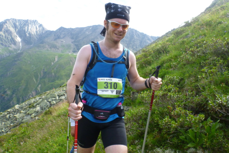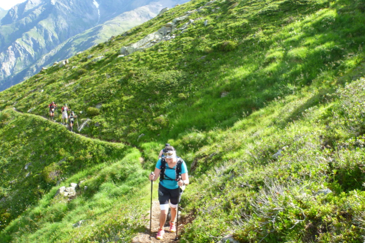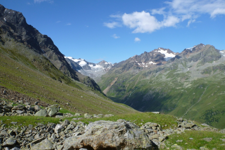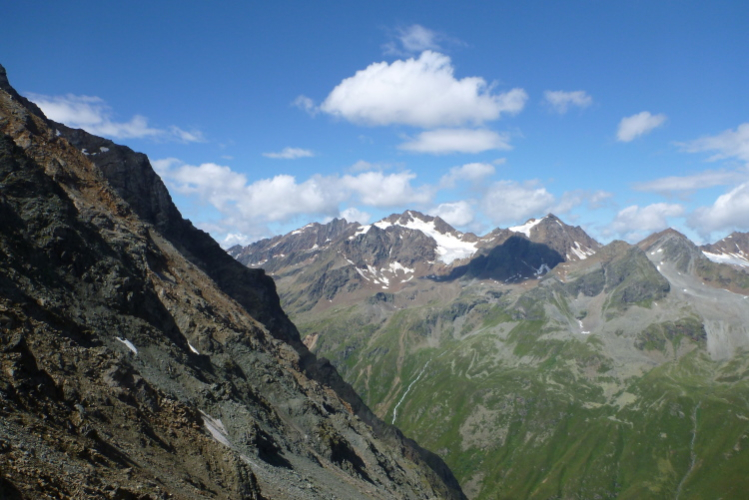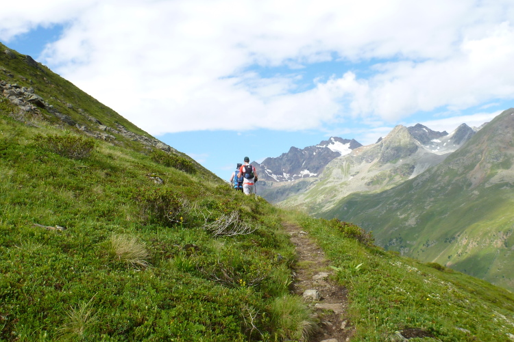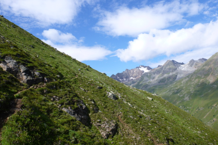 Fast in direkter Linie oder in engen Serpentinen geht es an der Südflanke des Mittagskogels hoch. Die Muskeln maulen und die direkte Sonneneinstrahlung sorgt dafür, es brennt. Doch mit jedem Höhenmeter wird die Aussicht auf das Pitztal prächtiger. Viele Blumen blühen noch auf den Wiesen. Kühe und Schafe werden hier jedenfalls nicht gehalten. Der etwa 50 Zentimeter breite Bergpfad ist in mühevoller Handarbeit gemäht worden, so dass wir jede Unebenheit, jede Stufe und jeden Absatz sofort sehen können.