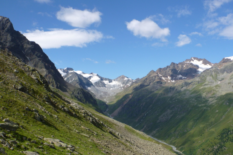 Immer weiter steigen wir auf, dann können wir auf der anderen Seite des Taschachtales den 2232 Meter hohen Rifflsee erkennen. Ruhig liegt das Gewässer in der Talmulde zwischen den hohen Bergen des Kaunergrats. Der Seebach, Abfluss des Sees, scheint eine Menge Schmelzwasser zu transportieren, denn der Geräuschpegel von jenseits des Taschachtals ist hoch.