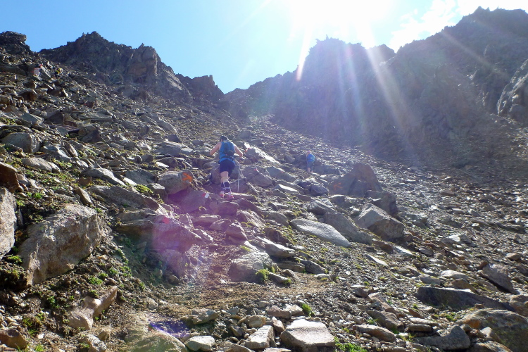 Ein Holländer geht vorbei mit langen Schritten, es ist bereits 11.00 Uhr vorbei. Joep Kerstjens murmelt etwas von 3000 Meter Höhe, aber er glaubt, dass wir noch 150 Höhenmeter darunter sind. Es wird noch steiler, die Stöcke könnte man jetzt in den Rucksack packen, sie behindern mehr als dass sie nützen. Vor allem ist jetzt erhöhte Aufmerksamkeit nötig, um keine Steine loszutreten. Die dünne Luft lässt die Lungen rasseln. Höhenanpassung schaut anders aus.