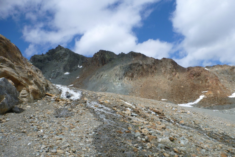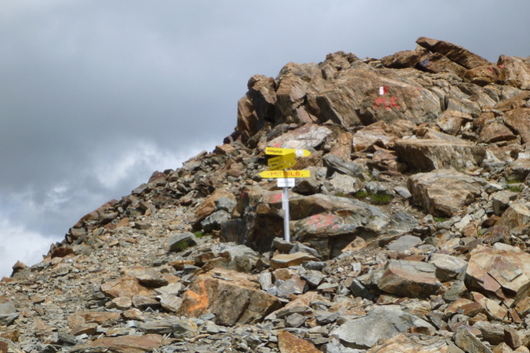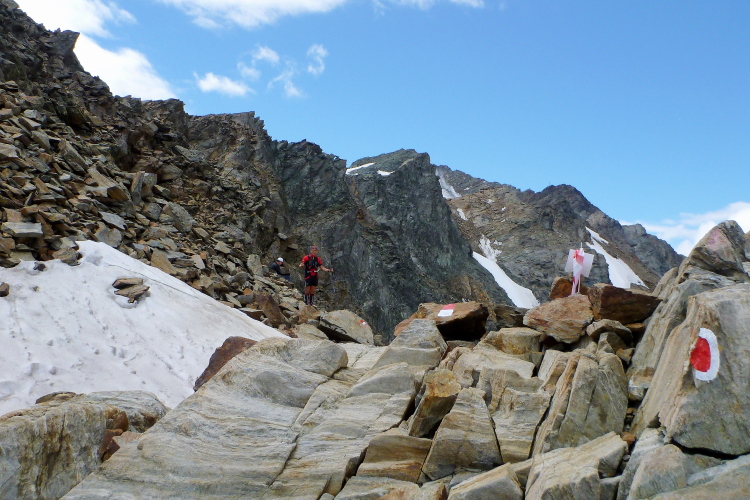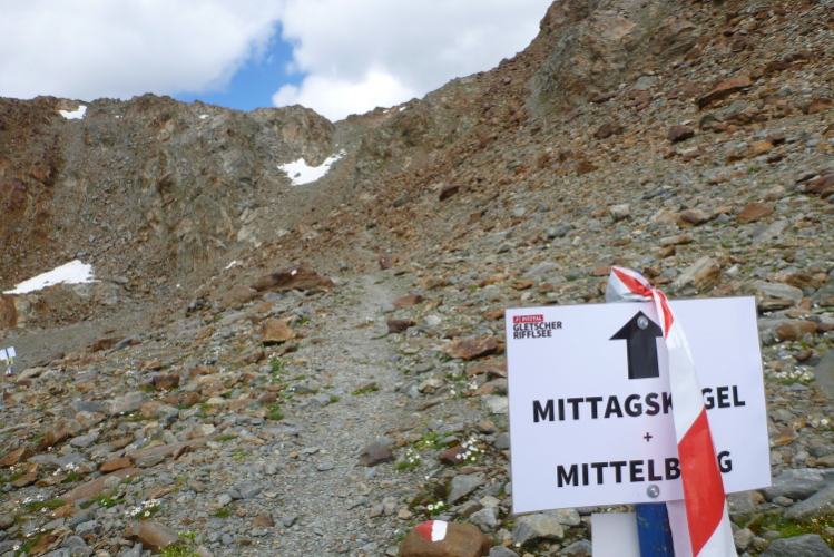 Fünf Minuten müssen wir durch Blockwerk klettern, dann sehe ich die Markierung, die auf den 3159 Meter hohen Mittagskogel linkerhand von uns zeigt. Und nach wenigen Augenblicken haben wir die Kraxelei endgültig geschafft, denn der Steig für Geübte wird deutlich bequemer. Wir joggen über zwei, drei kleinere Altschneefelder, dann sehen wir schon tief unter uns die Bergstation des Gletscherexpress.