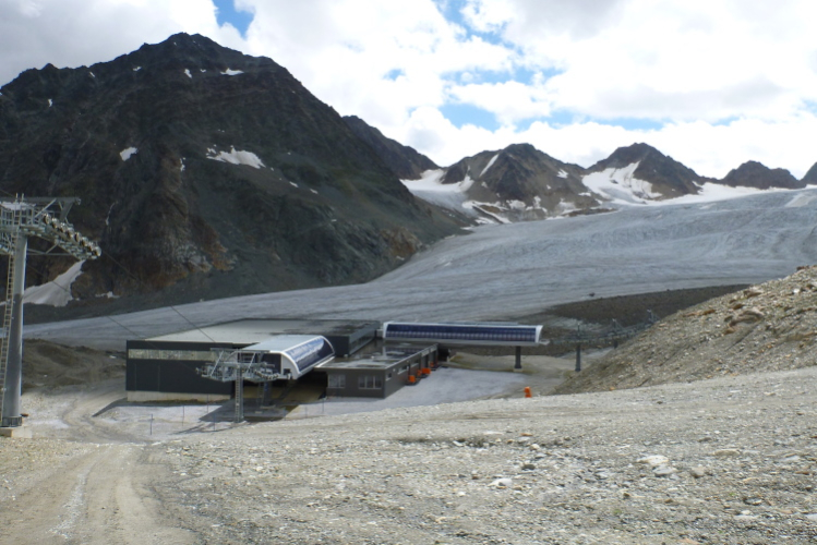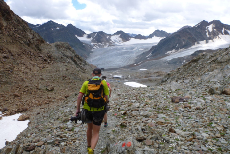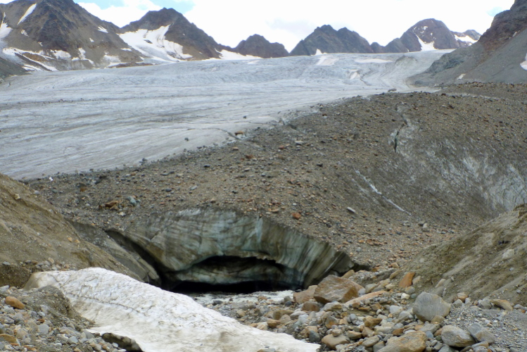 Gigantisch ist jedoch der Ausblick auf den Mittelbergferner. Der ist der zweitgrößte Gletscher (zehn Quadratkilometer) in Tirol, der auf einem Höhenniveau zwischen 3570 Meter und knapp 2300 Meter befindet. Umrahmt wird der Ferner vom Hinteren Brunnenkogel (3440 Meter), da hinauf geht eine Bahn zum Cafe 3440, vom Schuchtkogel, dem Weißen Kogel, Mutkogel und Linken Fernerkogel, alles Spitzen zwischen 3200 und 3500 Meter. Man kann es sich kaum vorstellen, aber der Gletscher ging um das Jahr 1855 noch bis auf 1795 Meter hinunter. Die Gletscherzunge, Bergführer sprechen auch vom Gletschermaul, lag damals nur 750 Meter talaufwärts von Mittelberg entfernt.