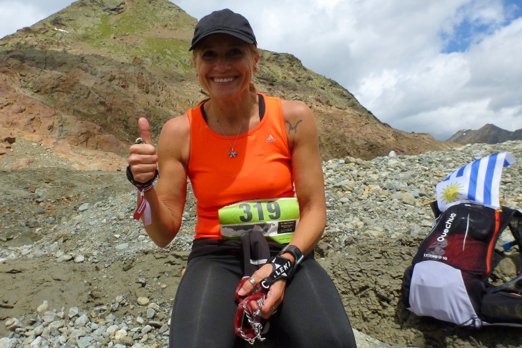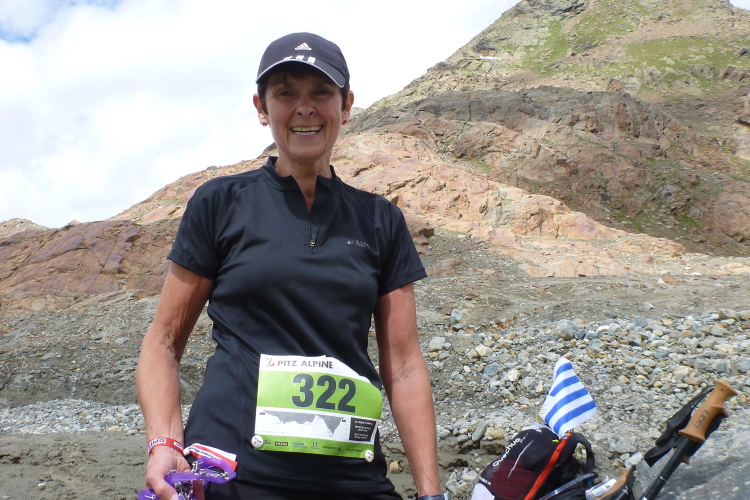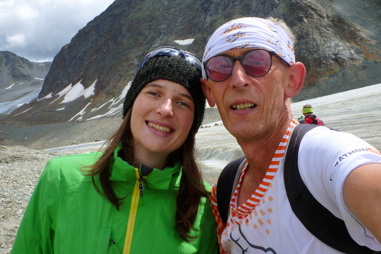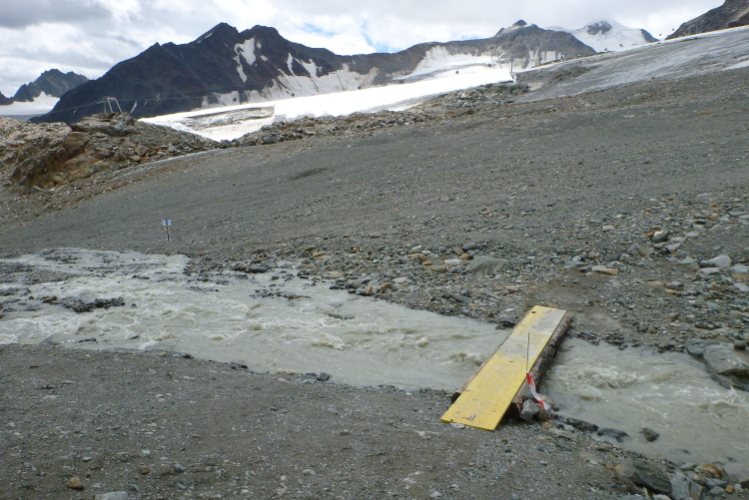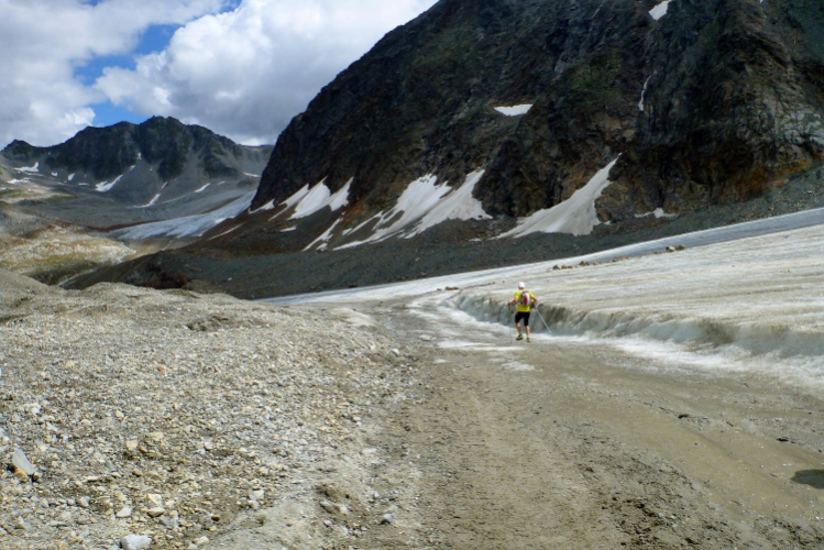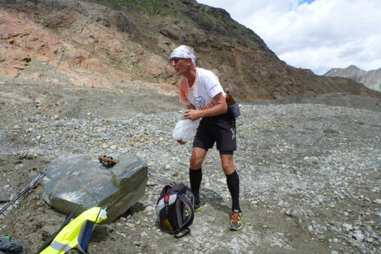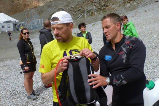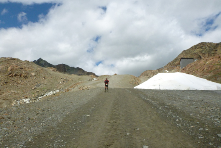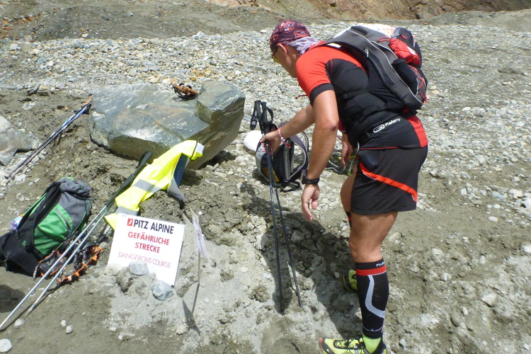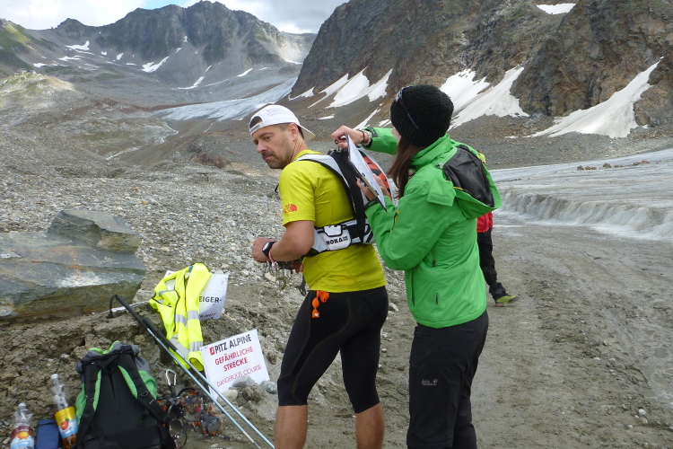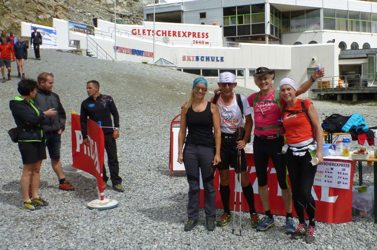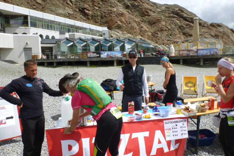 Ich verliere nur einige Momente, Erwin läuft jetzt auf. Nur kurz ist der Wortwechsel, dann macht er sich nach vorne langsam davon. Nach nur 20 Meter haben wir das stärkste Gefälle hinter uns gelassen. Ich muss meine Vorderleute beobachten, wo sie laufen, denn die Schmelzbäche sind teilweise so breit, dass du sie nicht überspringen kannst. Außerdem sieht man nicht, wie tief sie sind, das Wasser ist nämlich milchig. Über den größten Wasserlauf hilft eine Schaltafel. Um Punkt 12.00 Uhr erreichen wir die erste Verpflegungsstelle an der Bergstation Gletscherexpress (2840 Meter).