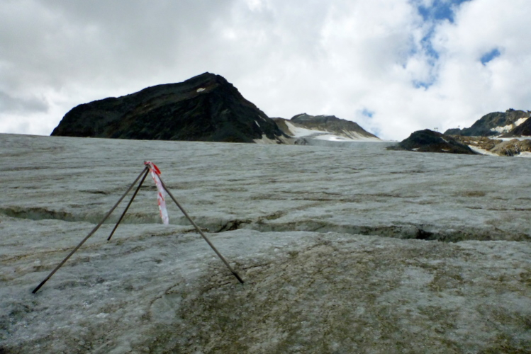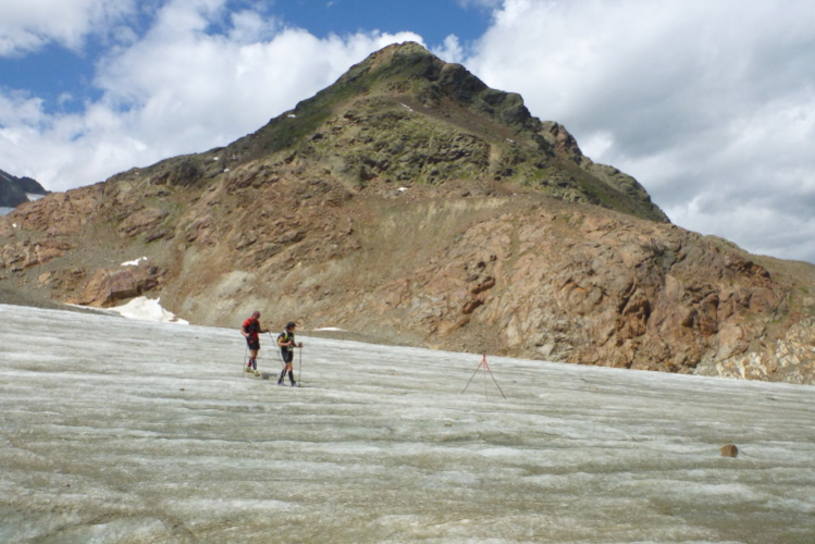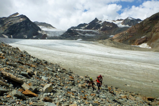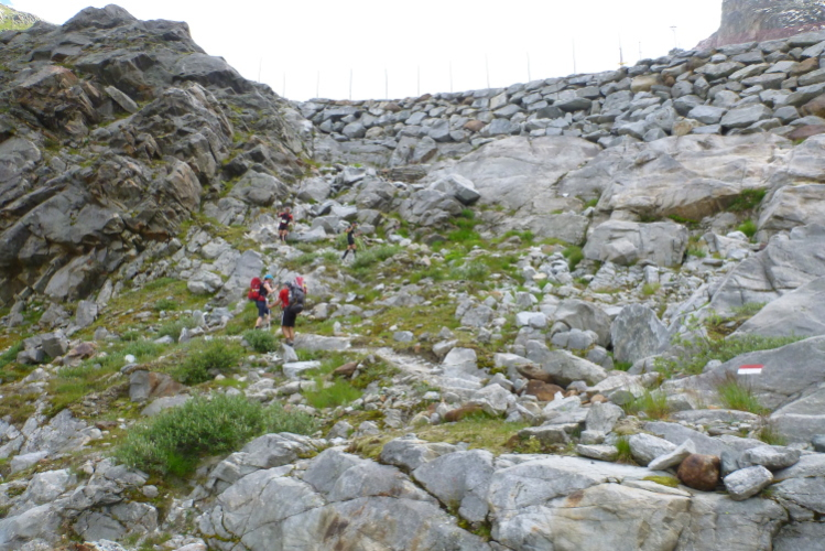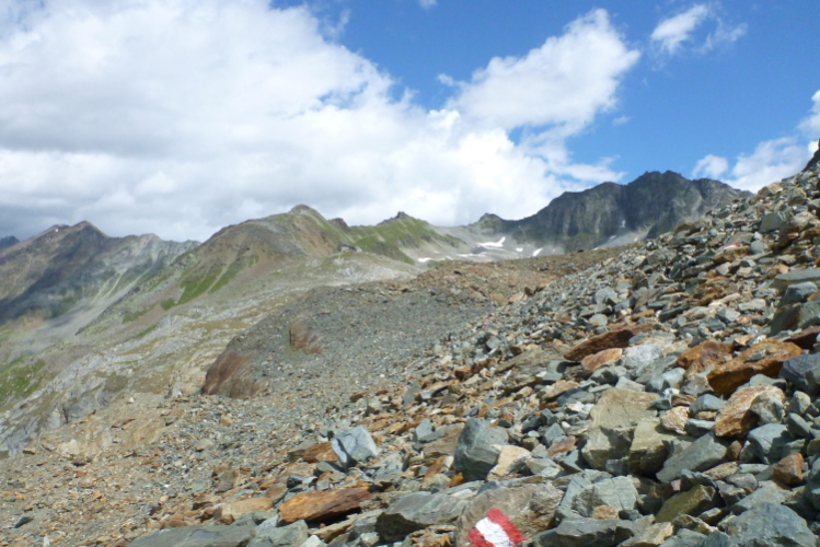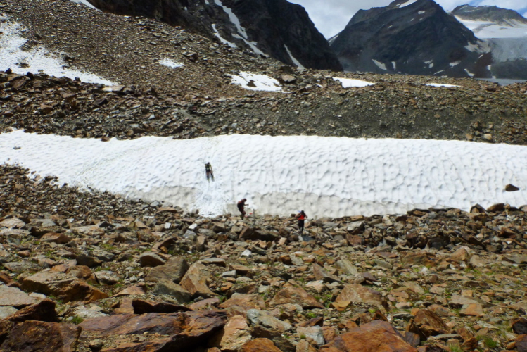 Der weitere Weg führt uns nun durch ein Gelände mit Schutt vom Linken Fernerkogel, der rechts von uns liegt. Wir wurden ermahnt, auch hier nicht mit der Konzentration nachzulassen, denn den Gletscher bedeckt eine Stein- und Schuttschicht. Du solltest also auf den Steinen laufen, denn an einigen Stellen blitzt das Eis hervor und man will ja nicht stürzen, wenn es einem den Fuß wegziehen sollte. Die Markierungen sind nicht immer gleich zu erkennen und meine drei Begleiter schicken mich voraus.