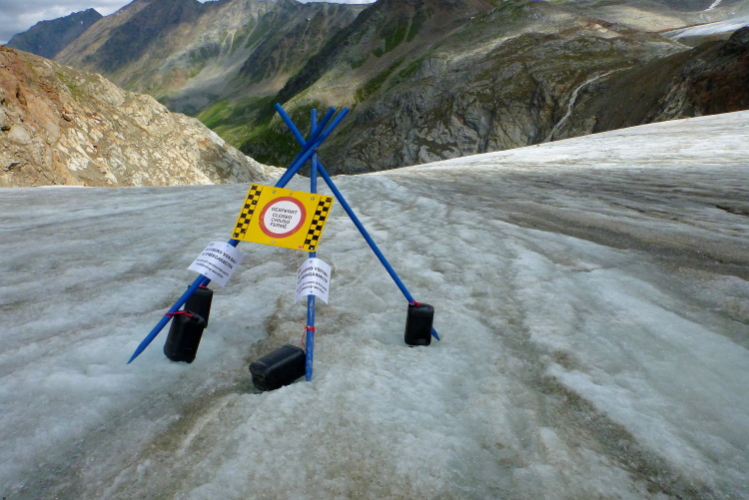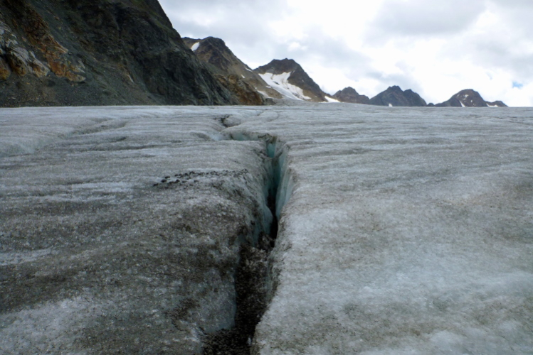 Nur ein paar Meter lang ist der nasse Übergang vom nicht gefrorenen Geröll zum Eis. Etwas ungewohnt ist das Laufen mit Spikes, die auf dem Eis eine gute Haftung haben. Man sollte vielleicht betont auf dem Vorderfuß laufen, denn die Nägel sind im vorderen Teil. Wir laufen den sogenannten Notweg hinunter. Nach einigen Jahren Streiterei zwischen Behörden und Anwohnern und Naturschützern wurde im Jahr 2006 das Projekt einer Talabfahrt durch das Grießtal hinunter nach Mittelberg durchgesetzt. Sinn und Zweck des Notweges soll sein, dass bei einem Ausfall der Gletscherbahn das Skigebiet geräumt werden kann.