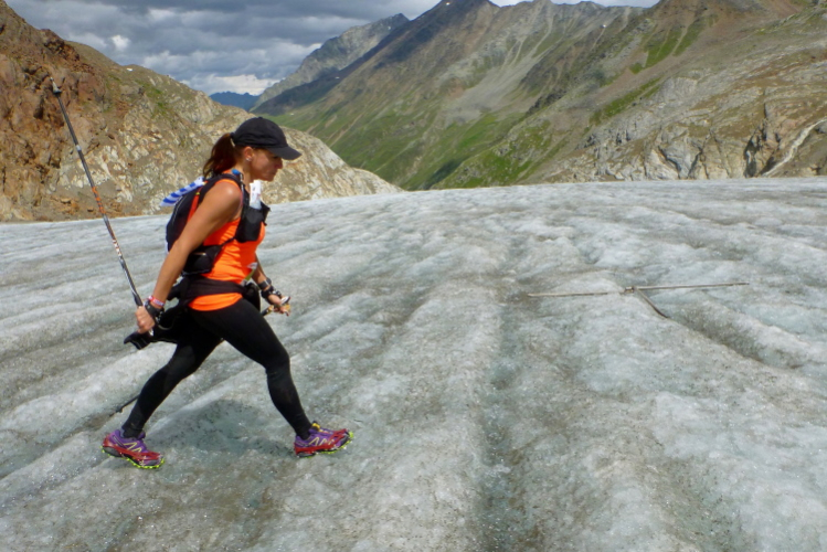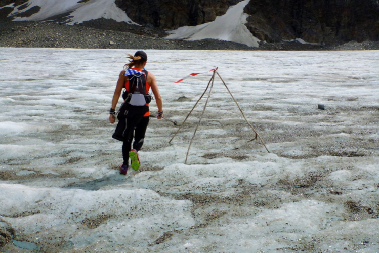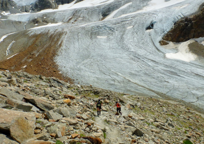 Etwa fünf Minuten laufen wir auf dem Notweg hinunter, dann ist der wegen Bau- und Sprengarbeiten gesperrt. Wir biegen rechts ab, die Stangen zeigen uns den weiteren Weg. Wir queren jetzt den Gletscher. Immer wieder fließen kleinere Rinnsale nach unten. Mir macht es Spaß, meine Begleiter zu fotografieren: Daniela Mangana kommt aus Uruguay, sowie Marina Oertwich und Toni Seitel.