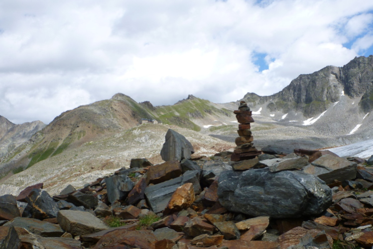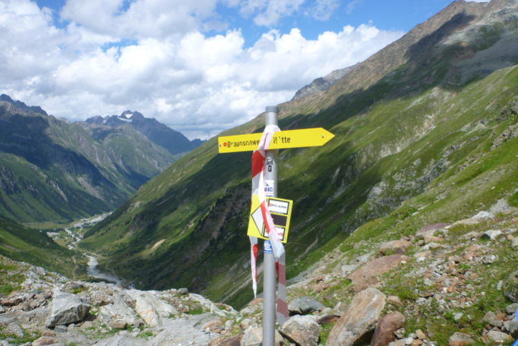Wir müssen mehr bergauf als bergab, bis wir gegen 13.00 Uhr die Braunschweiger Hütte vor uns sehen. Die liegt am Europäischen Fernwanderweg E 5. Vor acht Jahren stand ich hier auf dem Weg von Oberstdorf nach Meran, der Klassiker unter den Alpenüberquerungen. 1892 wurde die Unterkunft erbaut, später zwei Mal erweitert. Knapp 60 Betten und 130 Lager sind vorhanden. Die Aussichtsterrasse ist fast bis auf den letzten Platz besetzt. Drei Stunden soll man für den Aufstieg von Mandarfen benötigen. Aber wie lange wird unser Abstieg dauern?