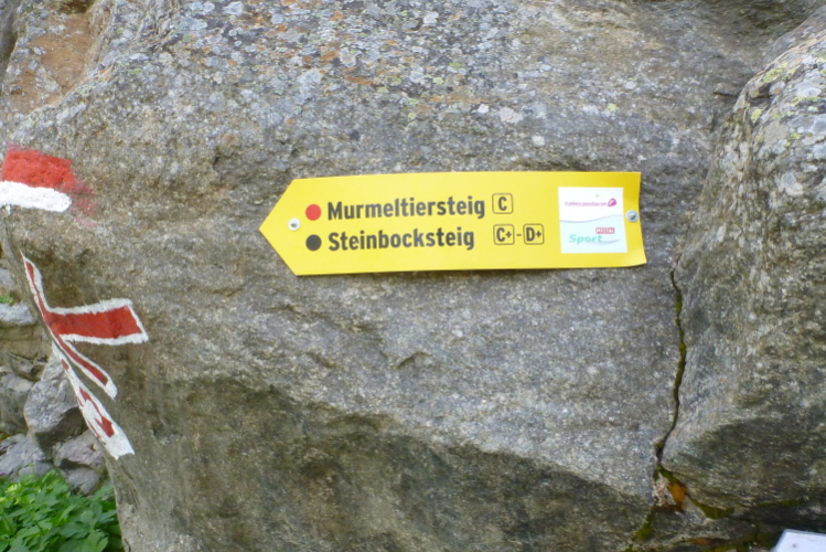 Zwei, drei Kehren laufen wir auf dem Notweg hinunter, dann zeigt ein Schild wieder nach rechts auf einen Singetrail. Auch hier müssen wir steil hinunter. Immer wieder können wir uns an Drahtseilen einhängen. „Da braucht Ihr Euch nicht schämen, zuzupacken“ hieß es beim Briefing. Einen besseren Stand hast du schon. Später zeigen Schilder den Murmeltiersteig und Steinbocksteig an. Die Drahtseile des Erlebnissteigs beginnen direkt am Bergweg.