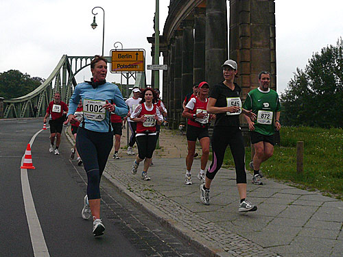 Ostwärts geht es weiter. Die Humboldtbrücke, die uns über die Havel bringt, muss für den Verkehr frei gehalten werden, sodass den Läufern nur der Rad- und Fußweg bleibt. Mit etwas Rücksicht geht es das ganz gut und gleich sind wir auf dem Naturweg am Tiefen See der Havel (km 5) und im Park Babelsberg. Sofort fällt der Flatowturm auf und mancher Marathoni ist sich sicher, diesen Turm schon einmal gesehen zu haben. Kein Wunder, er ist eine fast perfekte Kopie des Eschenheimer Turms in Frankfurt, dort einer der Highlights auf der Marathonstrecke.