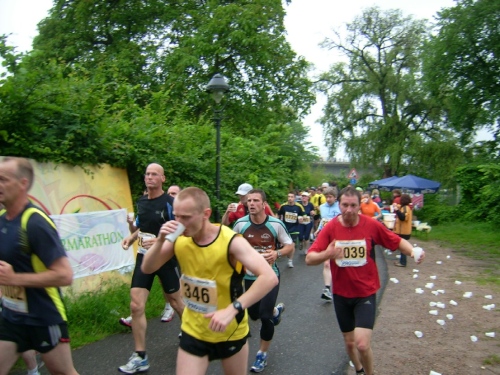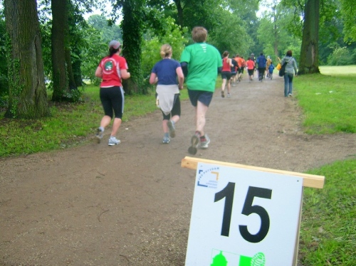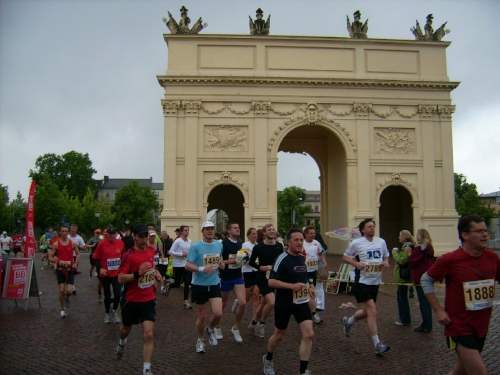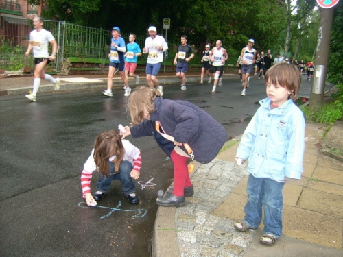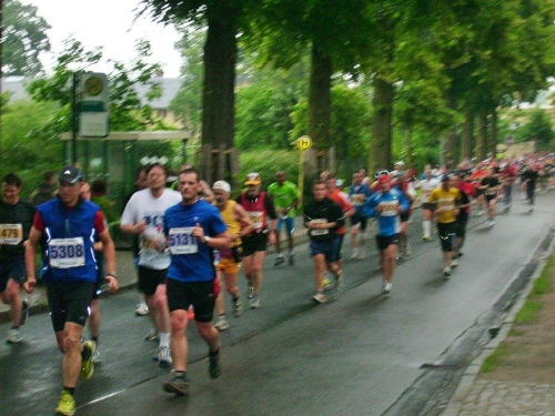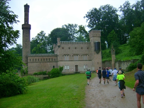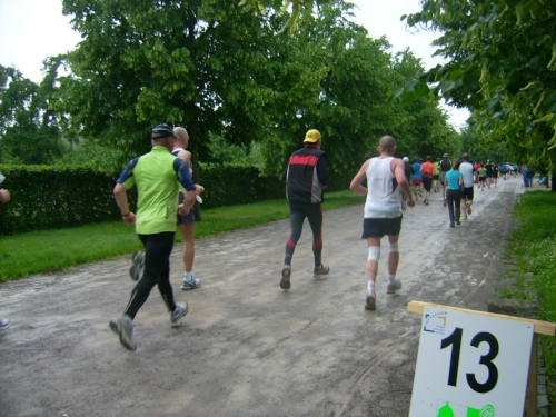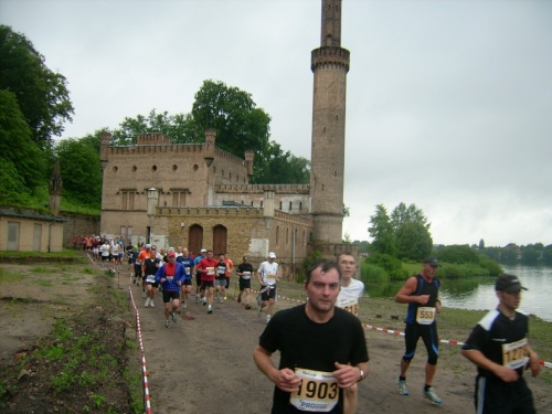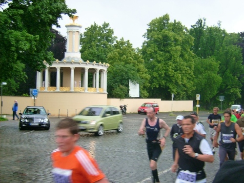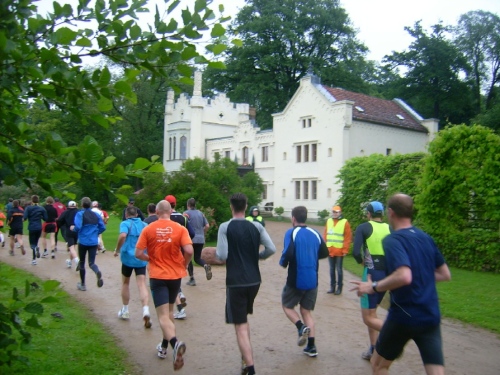 Am Ende der Brücke geht es mit einer Linkskurve in den Park Babelsberg, wo schon die zweite V-Stelle zu finden ist. Angeboten wird Wasser, Tee mit Traubenzucker, Cola, Bananen und Äpfel. Und wer sich Blasen gelaufen hat oder kurz davor steht, der kann sich mit Pflaster eindecken. Mich freut, dass die Helfer überaus eifrig sind und immerzu anfeuern. Mir fallen da zwei Mädchen auf, die unter einem Regenschirm in einem Busch hocken und mit ihrem Gekreische positiv herausragen.