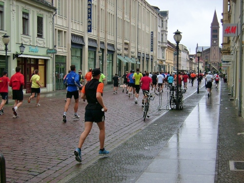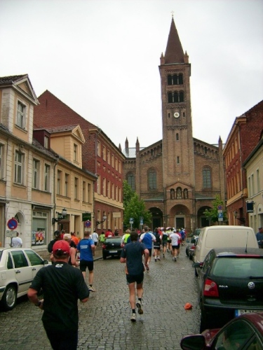 Wir sind jetzt in der Innenstadt angekommen. Auf der gepflasterten Brandenburger Straße mit seinen vielen Geschäftshäusern und Cafes links und rechts laufen wir auf die Kirche St. Peter und Paul zu. 1821 entstand diese katholische Kirche, um die wir fast herumlaufen.
