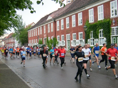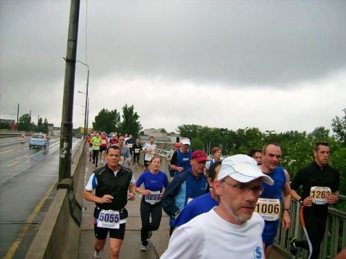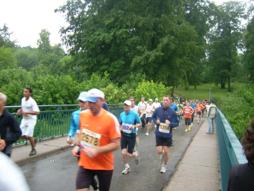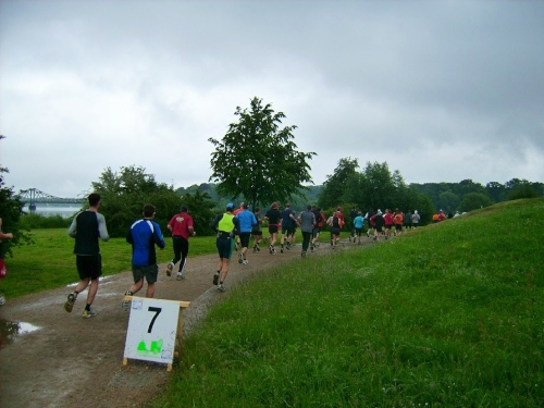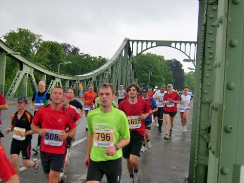 Es geht nun über die Humboldbrücke (Kilometer 6), die jedoch für den Verkehr frei gehalten werden muss. Für uns bleibt der Rad- und Fußweg als Laufstrecke übrig. Mit ein wenig Rücksichtnahme kommt das Läuferfeld auch drüber. Links sehen wir den Tiefen See der Havel.