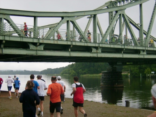 Wir sind jetzt im ehemaligen Westberlin angekommen. Wir können uns kaum noch vorstellen, wie die Menschen hier vor der Vereinigung mit der Mauer leben mussten. Es geht auf die Glienicker Brücke zu, die ab 1831 nach den Plänen von Karl Friedrich Schinkel erbaut wurde. Genau in der Mitte der Brücke war damals die Grenze von West und Ost, also Sperrgebiet und somit kaum einsehbar und völlig abschirmbar. Hier wurden Spione in die gegnerischen Lagen eingeschleust sowie unerwünschte Personen abgeschoben oder ausgetauscht.