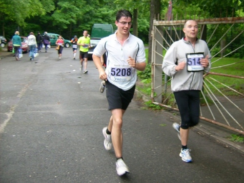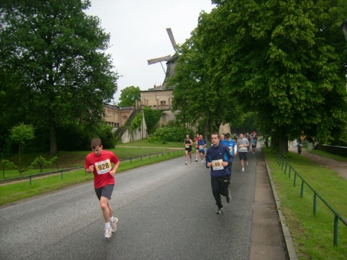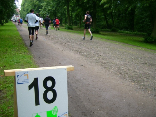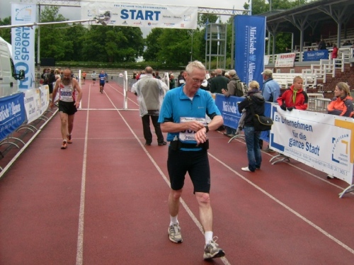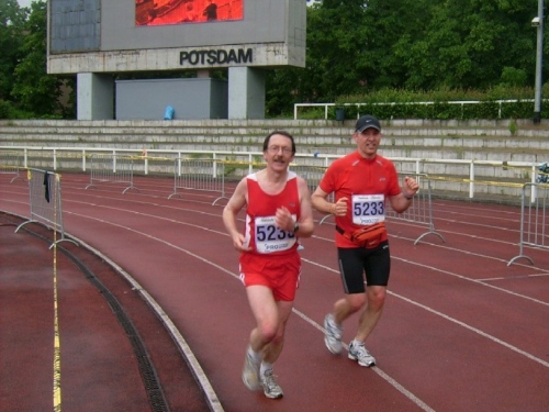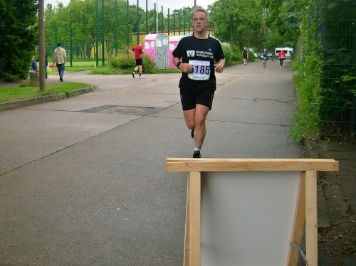Wir verlassen den großen Park Sans Souci („Ohne Sorgen“) am Ende der Lindenavenue, wo wir an einer Bahnunterführung die letzte V-Stelle nochmals ausgiebig nutzen können. Die Halbmarathonis können jetzt in der Forststraße ihren Endspurt setzen. Nach etwa zwei Kilometer sind wir wieder am Stadion Luftschiffhafen. Als im am Parkplatz vorbeilaufe, schere ich kurz aus, und tausche das nasse Shirt gegen ein trockenes.
