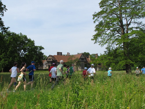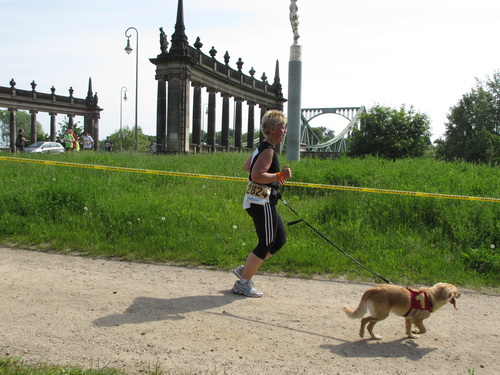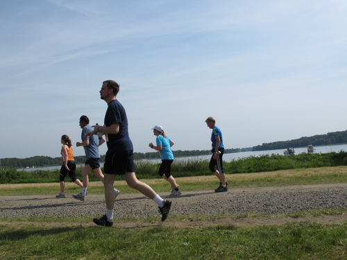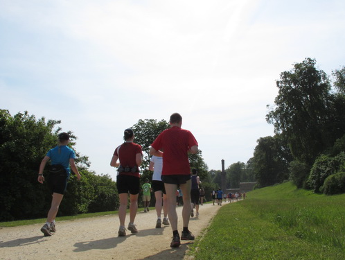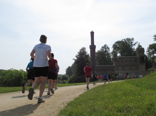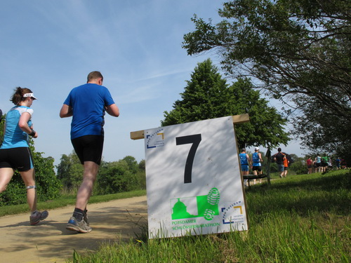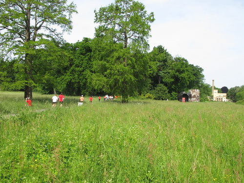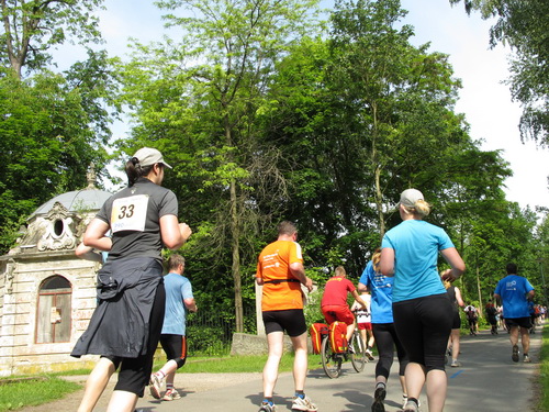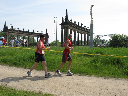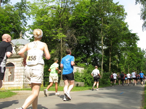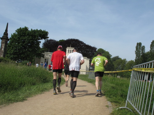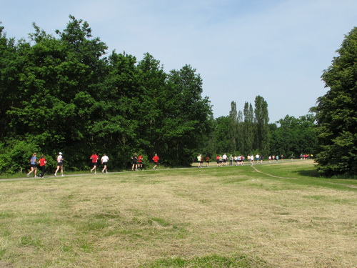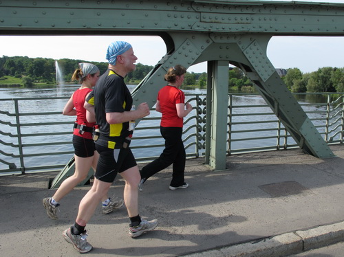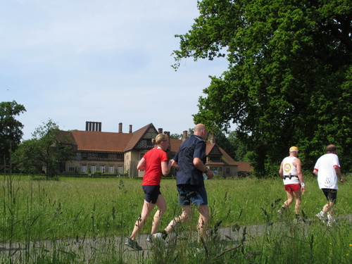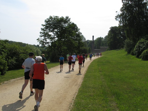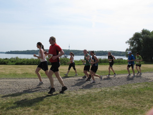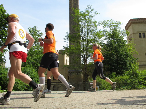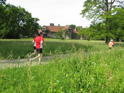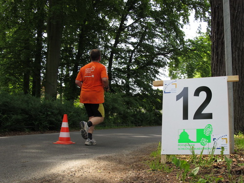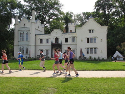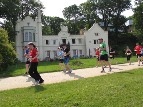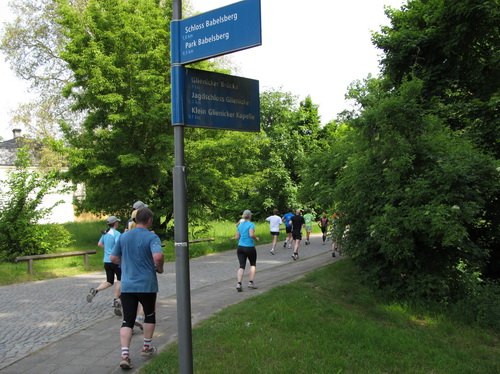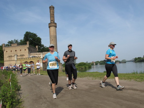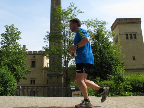 Der schmale Pfad durch die Wiesen des Havelufers (km 6,5) ist wunderschön, die Strandbäder noch kaum besucht. Vereinzelt trifft man auf Zuschauer oder Spaziergänger. Die Temperaturen sind noch ganz angenehm, der Lauf ein Genuss für’s Auge und für die Seele. Gleich sind wird am weißen Kleinen Schloss, das einmal vom einfachen Gartenhaus zum Wohnsitz des späteren Kaisers Friedrich III und seiner Frau Victoria 1833/34 umgebaut wurde. Wenig später taucht vor uns der schlanke Turm des Dampfmaschinenhauses (1843-45) auf. Mit sagenhaften 65 PS wurde die Bewässerung de Parks bewerkstelligt und eine 40 m hohe Wasserfontäne auf der Havel erzeugt. Im Obergeschoss wohnte Prinz Wilhelms Hofmarschall, dessen Passion der Landschaftsbau war, der aber mit einer Eiskreation weltberühmt wurde: Fürst Pückler.