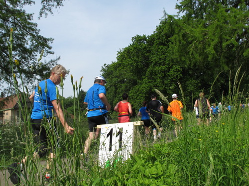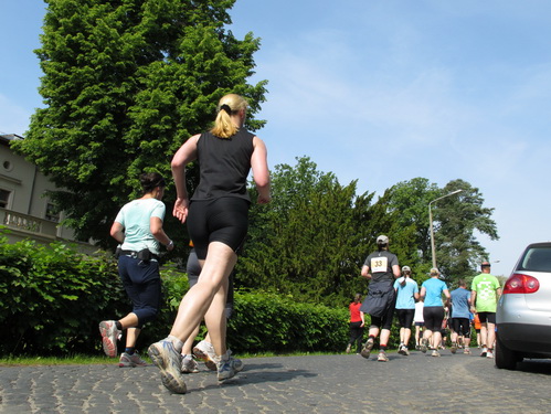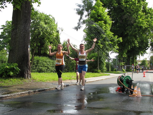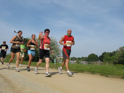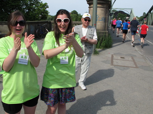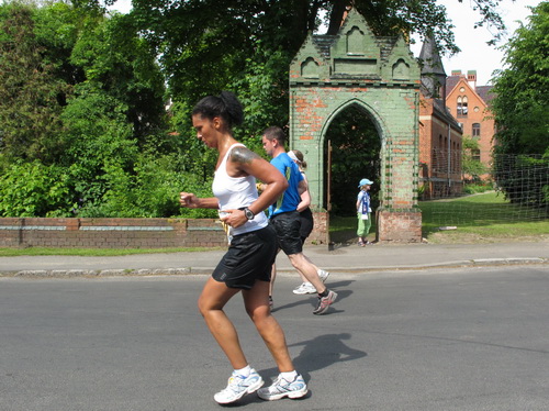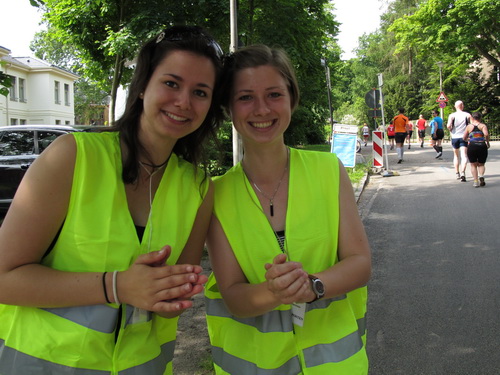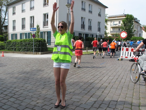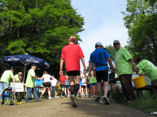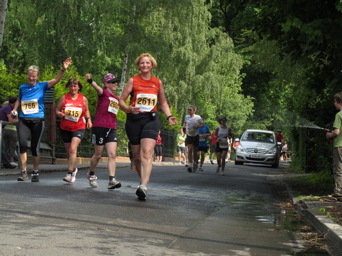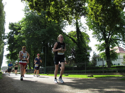 Einigermaßen schattig ist der folgende Streckenabschnitt, zusätzlich sorgen Anwohner für Erfrischung aus ihren Gartenschläuchen. Spätestens nach 4 Kilometern kommt auch immer eine Verpflegungsstelle mit Wasser, teilweise Tee, Äpfel und Bananen, später gibt es auch Cola. Zuschauer sind selten, die Aufgabe der Stimmungsmacher und Motivatoren übernehmen die Streckenposten.
